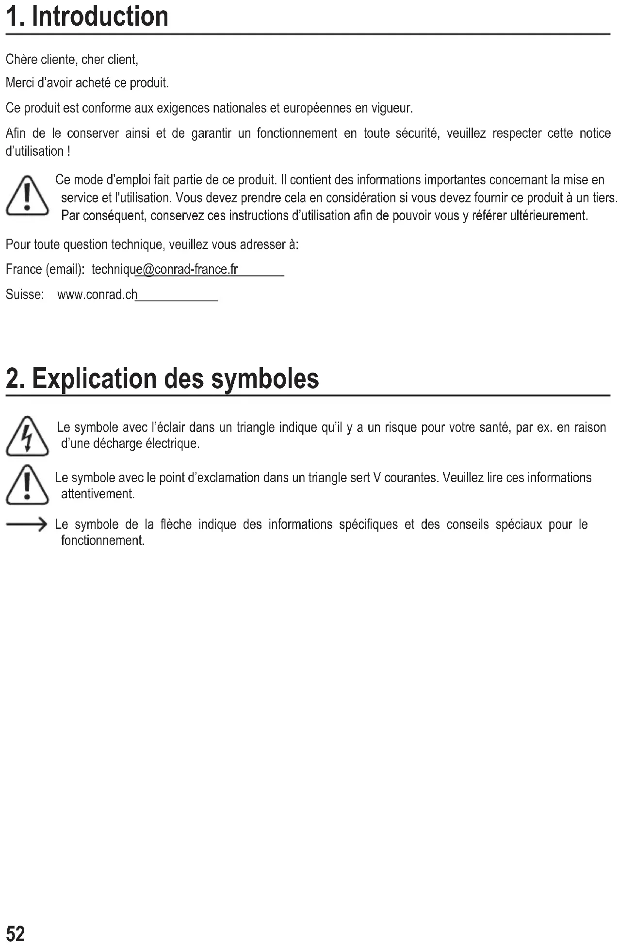 Chère cliente, cher client, Merci d’avoir acheté ce produit. Ce produit est conforme aux exigences nationales et européennes en vigueur. An de le conserver ainsi et de garantir un fonctionnement en toute sécurité, veuillez respecter cette notice d’utilisation ! Ce mode d’emploi fait partie de ce produit. Il contient des informations importantes concernant la mise en service et l'utilisation. Vous devez prendre cela en considération si vous devez fournir ce produit à un tiers. Par conséquent, conservez ces instructions d’utilisation an de pouvoir vous y référer ultérieurement. Pour toute question technique, veuillez vous adresser à: France (email): technique@conrad-france.fr Suisse: www.conrad.ch