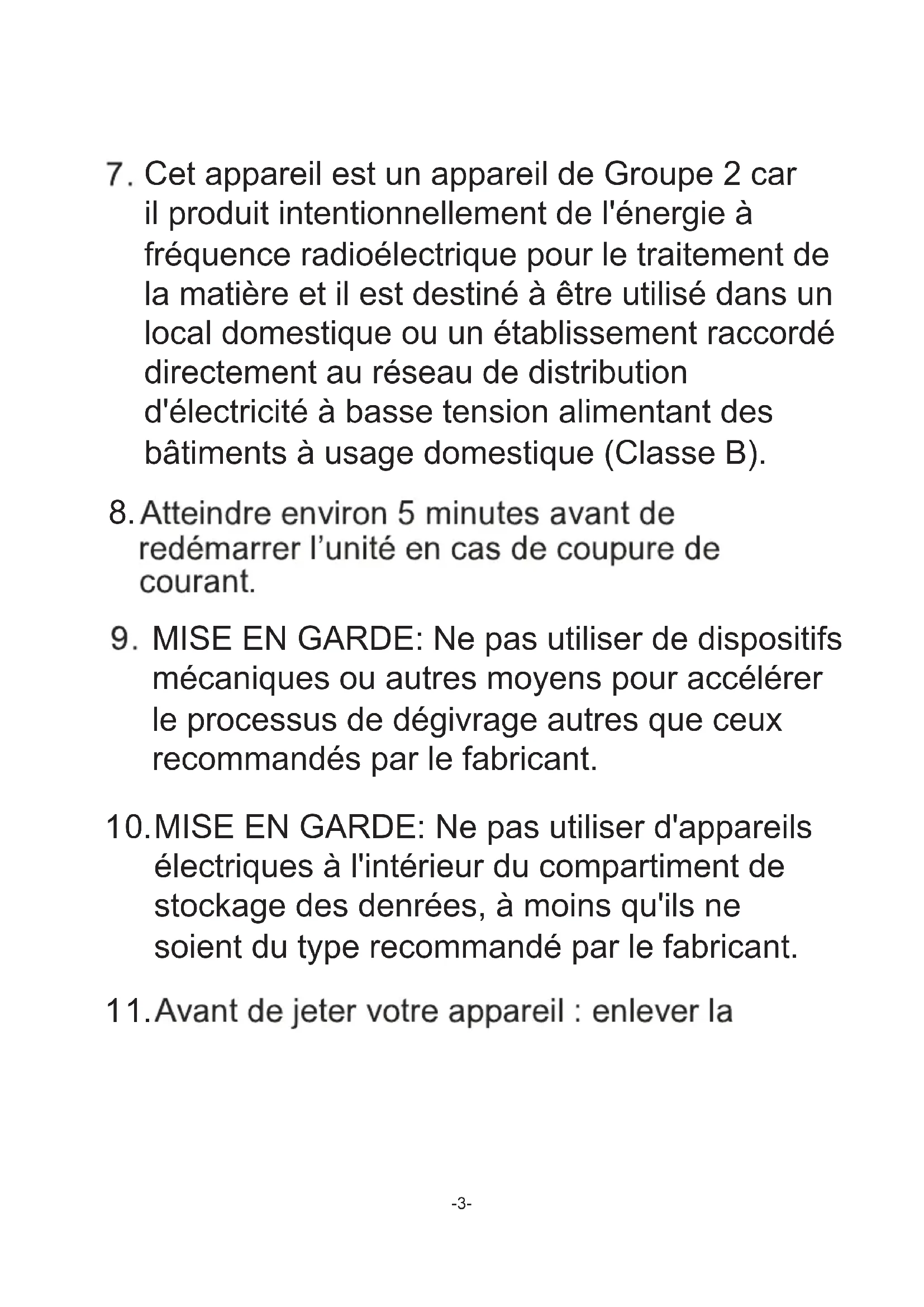 -17--1--2--3- Cet appareil est un appareil de Groupe 2 car il produit intentionnellement de l'énergie à fréquence radioélectrique pour le traitement de la matière et il est destiné à être utilisé dans un local domestique ou un établissement raccordé directement au réseau de distribution MISE EN GARDE: Ne pas utiliser de dispositifs mécaniques ou autres moyens pour accélérer le processus de dégivrage autres que ceux recommandés par le fabricant. MISE EN GARDE: Ne pas utiliser d'appareils électriques à l'intérieur du compartiment de stockage des denrées, à moins qu'ils ne soient du type recommandé par le fabricant. d'électricité à basse tension alimentant des bâtiments à usage domestique (Classe B).
