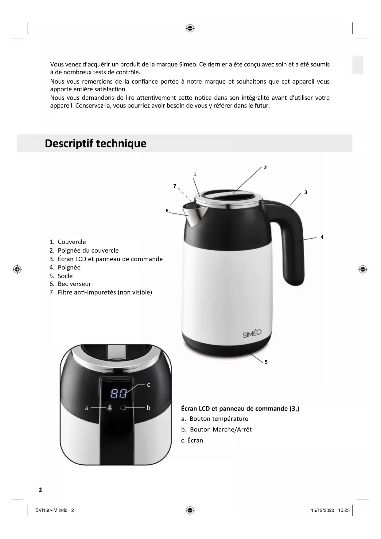 BVI160-IM.indd 1BVI160-IM.indd 1 15/12/2020 10:2315/12/2020 10:232 Descriptif technique Vous venez d’acquérir un produit de la marque Siméo. Ce dernier a été conçu avec soin et a été soumis à de nombreux tests de contrôle. Nous vous remercions de la confiance portée à notre marque et souhaitons que cet appareil vous apporte entière satisfaction. Nous vous demandons de lire attentivement cette notice dans son intégralité avant d’utiliser votre appareil. Conservez-la, vous pourriez avoir besoin de vous y référer dans le futur.