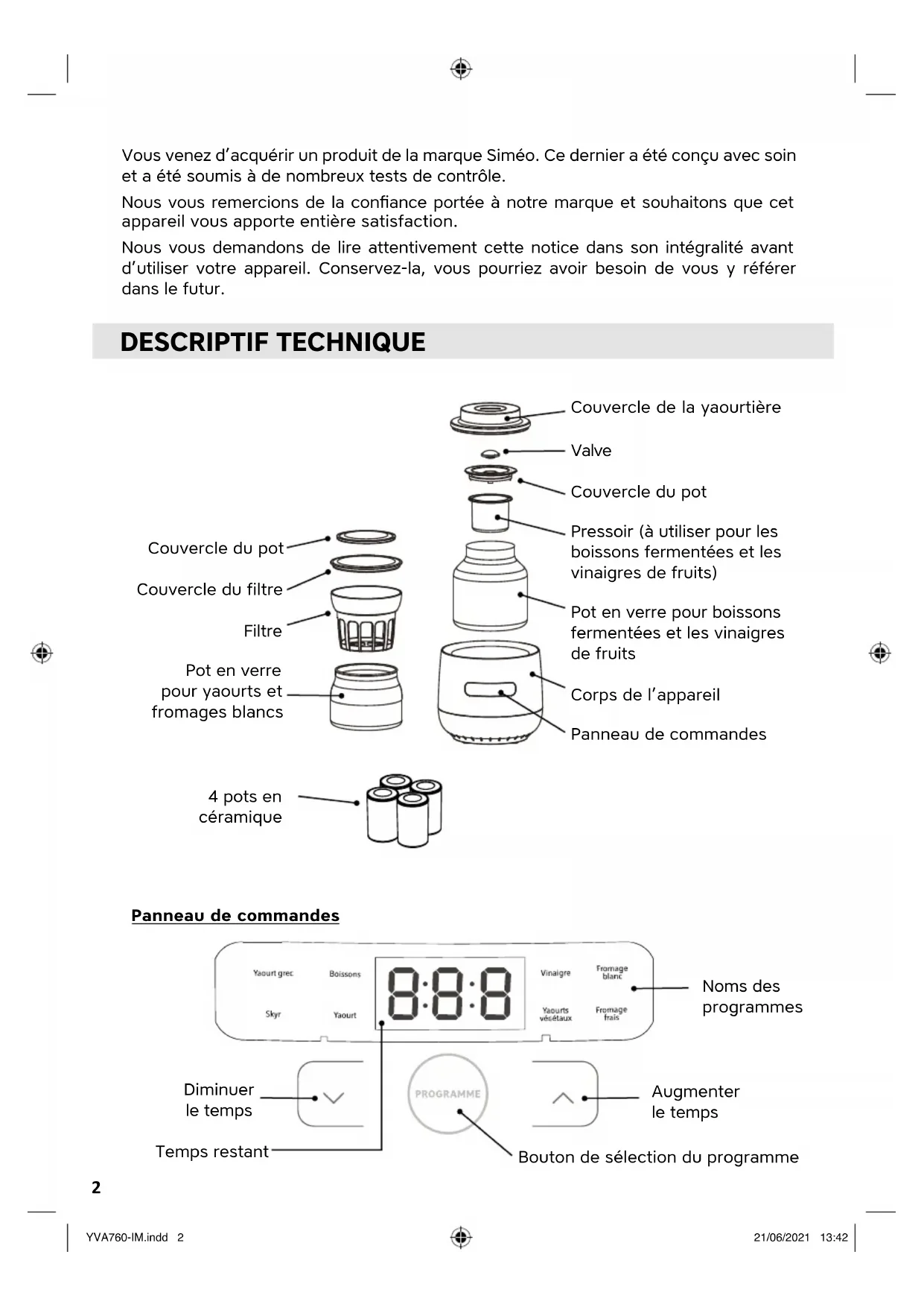 YVA760-IM.indd 1YVA760-IM.indd 1 21/06/2021 13:4121/06/2021 13:412 Vous venez d’acquérir un produit de la marque Siméo. Ce dernier a été conçu avec soin et a été soumis à de nombreux tests de contrôle. Nous vous remercions de la conance portée à notre marque et souhaitons que cet appareil vous apporte entière satisfaction. Nous vous demandons de lire attentivement cette notice dans son intégralité avant d’utiliser votre appareil. Conservez-la, vous pourriez avoir besoin de vous y référer dans le futur. DESCRIPTIF TECHNIQUE Couvercle de la yaourtière Valve Couvercle du pot Pressoir (à utiliser pour les boissons fermentées et les vinaigres de fruits) Pot en verre pour boissons fermentées et les vinaigres de fruits Corps de l’appareil Panneau de commandes Couvercle du pot Couvercle du filtre Filtre Pot en verre pour yaourts et fromages blancs 4 pots en céramique Panneau de commandes Bouton de sélection du programme Temps restant Diminuer le temps Augmenter le temps Noms des programmes YVA760-IM.indd 2YVA760-IM.indd 2 21/06/2021 13:4221/06/2021 13:423