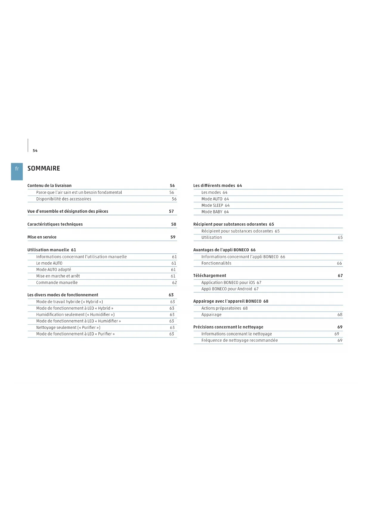 SOMMAIRE Les diérents modes 64 Les modes 64 Mode AUTO 64 Mode SLEEP 64 Mode BABY 64 Récipient pour substances odorantes 65 Récipient pour substances odorantes 65 Utilisation 65 Avantages de l’appli BONECO 66 Informations concernant l’appli BONECO 66 Fonctionnalités 66 Téléchargement 67 Application BONECO pour iOS 67 Appli BONECO pour Android 67 Appairage avec l’appareil BONECO 68 Actions préparatoires 68 Appairage 68 Précisions concernant le nettoyage 69 Informations concernant le nettoyage 69 Fréquence de nettoyage recommandée 69 Contenu de la livraison 56 Parce que l’air sain est un besoin fondamental 56 Disponibilité des accessoires 56 Vue d’ensemble et désignation des pièces 57 Caractéristiques techniques 58 Mise en service 59 Utilisation manuelle 61 Informations concernant l’utilisation manuelle 61 Le mode AUTO 61 Mode AUTO adapté 61 Mise en marche et arrêt 61 Commande manuelle 62 Les divers modes de fonctionnement 63 Mode de travail hybride («Hybrid») 63 Mode de fonctionnement à LED «Hybrid » 63 Humidification seulement («Humidifier») 63 Mode de fonctionnement à LED «Humidifier» 63 Nettoyage seulement («Purifier») 63 Mode de fonctionnement à LED «Purifier» 6355