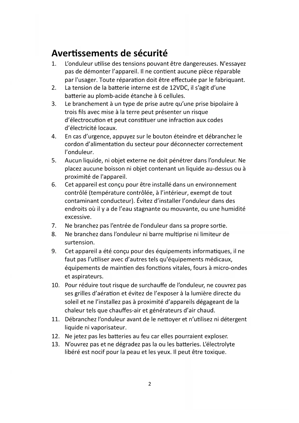 11. Débranchez l’onduleur avant de le nettoyer et n’utilisez ni détergent
