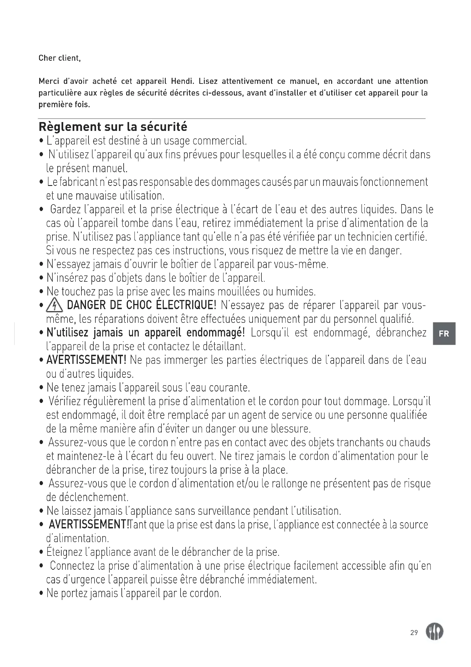 Cher client, Merci d’avoir acheté cet appareil Hendi. Lisez attentivement ce manuel, en accordant une attention particulière aux règles de sécurité décrites ci-dessous, avant d’installer et d’utiliser cet appareil pour la première fois. Règlement sur la sécurité