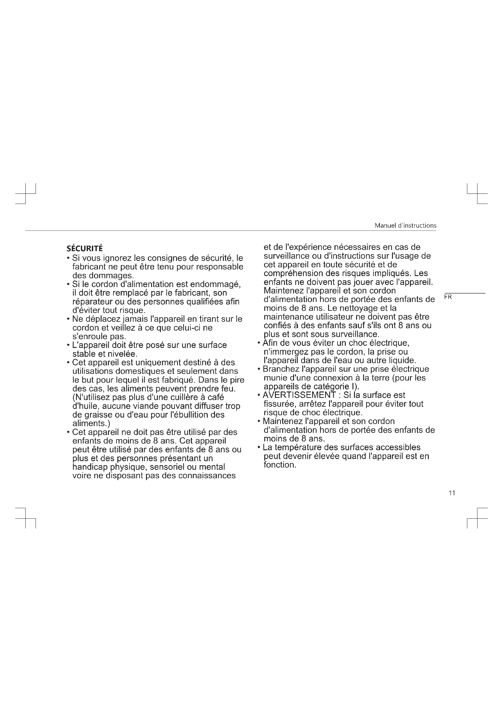 - La température des surfaces accessibles peut devenir élevée quand l'appareil est en fonction. FRManuel d'instructions