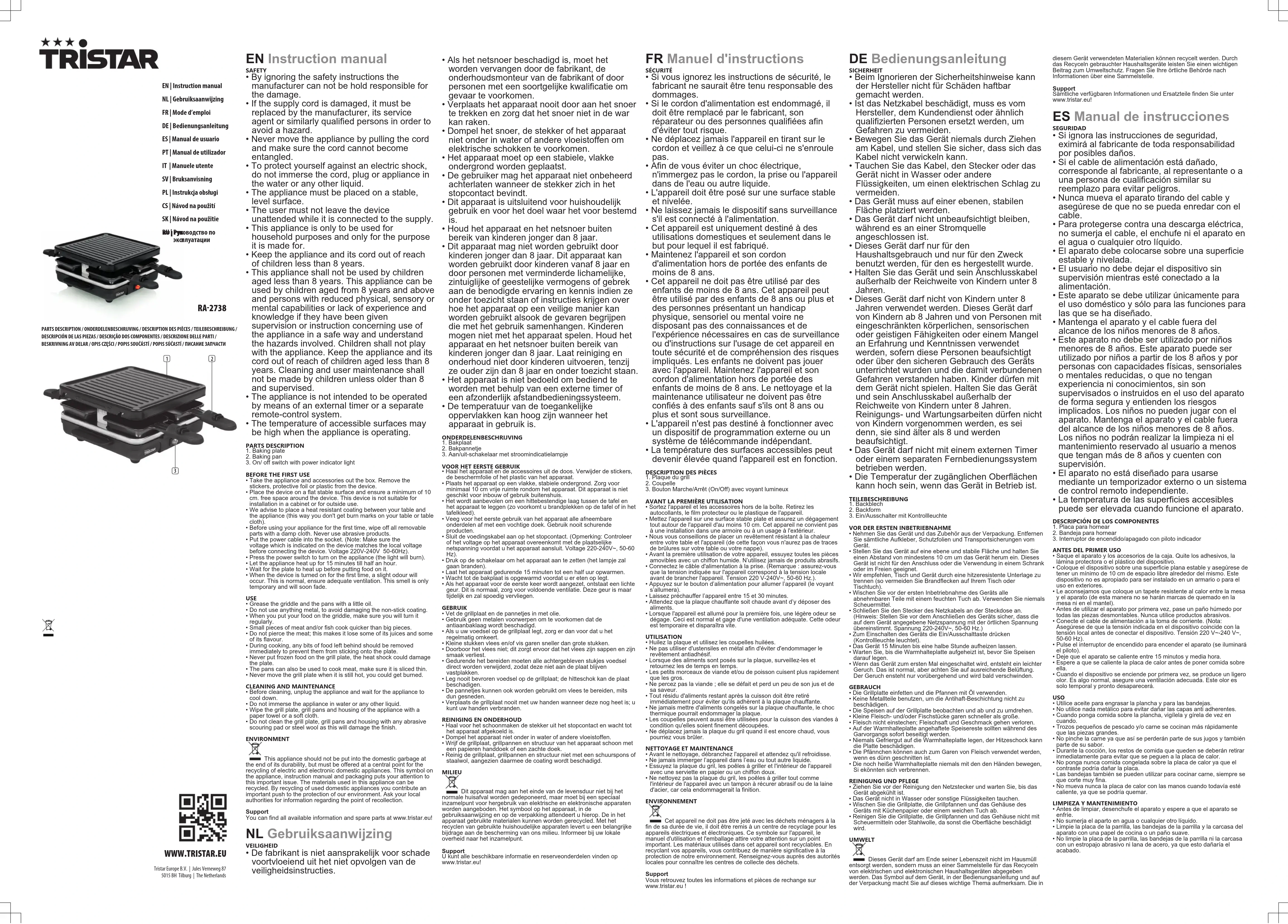 - La température des surfaces accessibles peut devenir élevée quand l'appareil est en fonction. DESCRIPTION DES PIÈCES1. Plaque du grill2. Coupelle3. Bouton Marche/Arrêt (On/Off) avec voyant lumineuxAVANT LA PREMIÈRE UTILISATION• Sortez l'appareil et les accessoires hors de la boîte.Retirez lesautocollants, le film protecteur ou le plastique de l'appareil.• Mettez l'appareil sur une surface stable plate et assurez un dégagementtout autour de l'appareil d'au moins 10 cm. Cet appareil ne convient pasà une installation dans une armoire ou à un usage à l'extérieur.• Nous vous conseillons de placer un revêtement résistant à la chaleurentre votre table et l'appareil (de cette façon vous n'aurez pas de tracesde brûlures sur votre table ou votre nappe).• Avant la première utilisation de votre appareil, essuyez toutes les piècesamovibles avec un chiffon humide. N’utilisez jamais de produits abrasifs.• Connectez le câble d'alimentation à la prise. (Remarque : assurez-vousque la tension indiquée sur l'appareil correspond à la tension localeavant de brancher l'appareil. Tension 220 V-240V~, 50-60 Hz.).• Appuyez sur le bouton d’alimentation pour allumer l’appareil (le voyants’allumera).• Laissez préchauffer l’appareil entre 15 et 30 minutes.• Attendez que la plaque chauffante soit chaude avant d’y déposer desaliments.• Lorsque l'appareil est allumé pour la première fois, une légère odeur sedégage. Ceci est normal et gage d'une ventilation adéquate. Cette odeurest temporaire et disparaîtra vite.UTILISATION• Huilez la plaque et utilisez les coupelles huilées.• Ne pas utiliser d'ustensiles en métal afin d'éviter d'endommager lerevêtement antiadhésif.• Lorsque des aliments sont posés sur la plaque, surveillez-les etretournez les de temps en temps.• Les petits morceaux de viande et/ou de poisson cuisent plus rapidementque les gros.• Ne percez pas la viande; elle se défait et perd un peu de son jus et desa saveur.• Tout résidu d'aliments restant après la cuisson doit être retiréimmédiatement pour éviter qu'ils adhèrent à la plaque chauffante.• Ne jamais mettre d'aliments congelés sur la plaque chauffante, le chocthermique pourrait endommager la plaque.• Les coupelles peuvent aussi être utilisées pour la cuisson des viandes àcondition qu'elles soient finement découpées.• Ne déplacez jamais la plaque du gril quand il est encore chaud, vouspourriez vous brûler.NETTOYAGE ET MAINTENANCE• Avant le nettoyage, débranchez l'appareil et attendez qu'il refroidisse.• Ne jamais immerger l’appareil dans l’eau ou tout autre liquide.• Essuyez la plaque du gril, les poêles à griller et l'intérieur de l'appareilavec une serviette en papier ou un chiffon doux.• Ne nettoyez pas la plaque du gril, les poêles à griller tout commel'intérieur de l'appareil avec un tampon à récurer abrasif ou de la lained'acier, car cela endommagerait la finition.ENVIRONNEMENTCet appareil ne doit pas être jeté avec les déchets ménagers à lafin de sa durée de vie, il doit être remis à un centre de recyclage pour lesappareils électriques et électroniques. Ce symbole sur l'appareil, lemanuel d'utilisation et l'emballage attire votre attention sur un pointimportant. Les matériaux utilisés dans cet appareil sont recyclables. Enrecyclant vos appareils, vous contribuez de manière significative à laprotection de notre environnement. Renseignez-vous auprès des autoritéslocales pour connaître les centres de collecte des déchets.SupportVous retrouvez toutes les informations et pièces de rechange surwww.tristar.eu! DEBedienungsanleitung SICHERHEIT