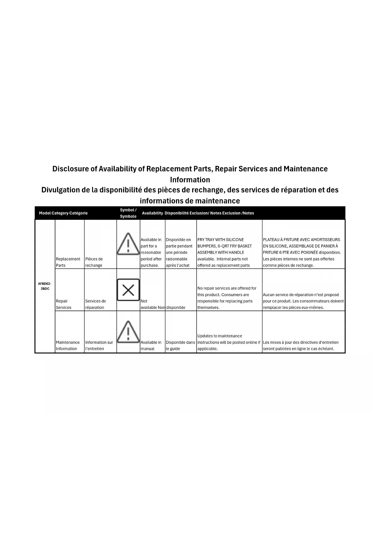 FRITURE 6 PTE AVEC POIGNÉE disponibles. Les pièces internes ne sont pas offertes comme pièces de rechange. Repair Services Services de réparation Not available Non disponible No repair services are offered for this product. Consumers are responsible for replacing parts themselves. Aucun service de réparation n’est proposé pour ce produit. Les consommateurs doivent remplacer les pièces eux-mêmes. Maintenance Information Information sur l’entretien Available in manual Disponible dans le guide Updates to maintenance instructions will be posted online if applicable. Les mises à jour des directives d’entretien seront publiées en ligne le cas échéant. Disclosure of Availability of Replacement Parts, Repair Services and Maintenance Information Divulgation de la disponibilité des pièces de rechange, des services de réparation et des informations de maintenance AFBD62- 2BDCReplacement Parts Pièces de rechange Available in part for a reasonable period after purchase. Non disponible