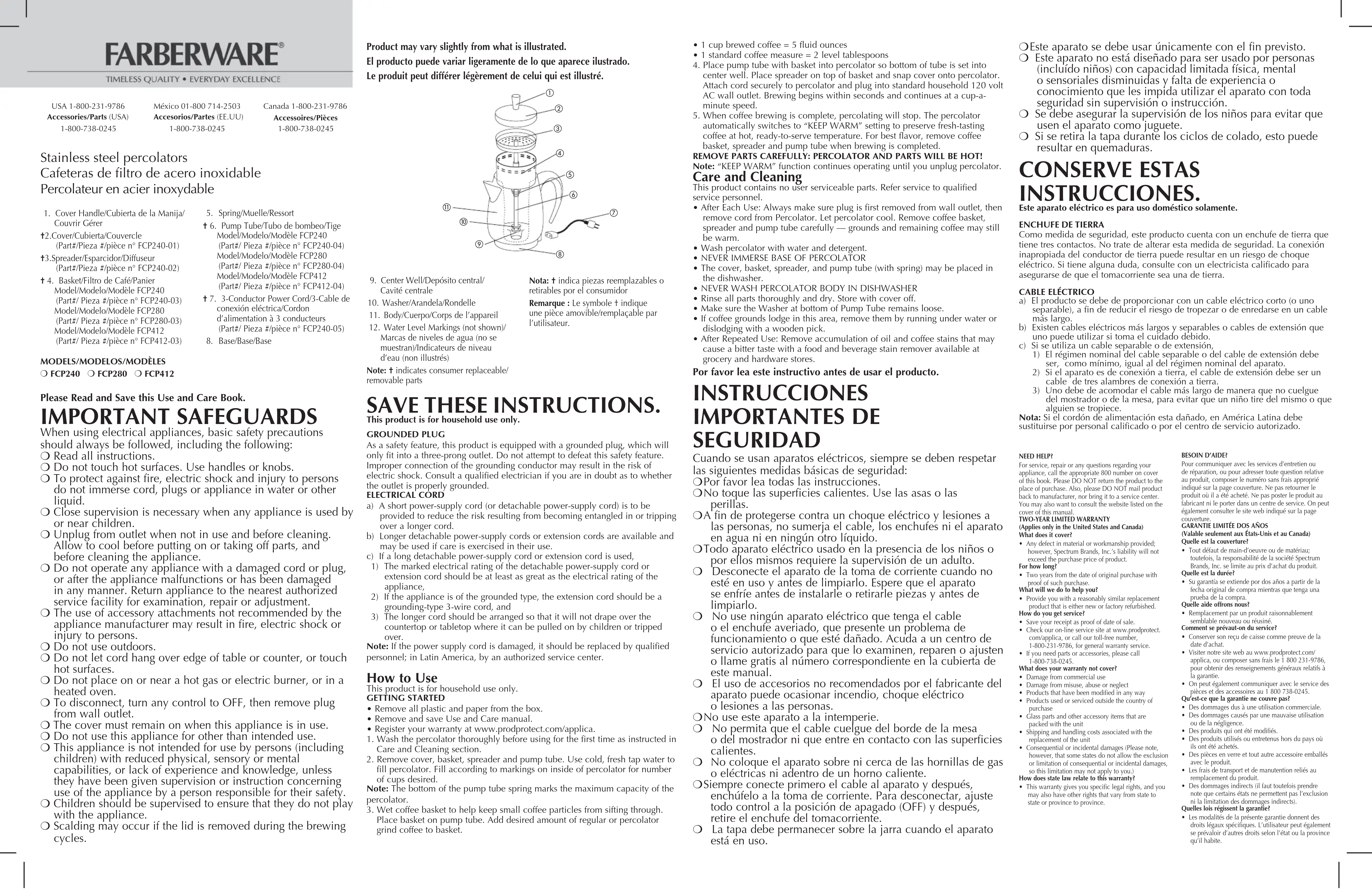 Lorsqu’on utilise des appareils électriques, il faut toujours respecter certaines règles de sécurité fondamentales, notamment les suivantes : ❍ Lire toutes les directives. ❍ Ne pas toucher aux surfaces chaudes; utiliser les poignées et les boutons. ❍ Afin d’éviter les risques d’incendie, de choc électrique ou de blessures, ne pas immerger le cordon, la fiche ou la base de l’appareil dans l’eau ou tout autre liquide. ❍ Exercer une étroite surveillance lorsque l’appareil est utilisé par un enfant ou près d’un enfant. ❍ Débrancher l’appareil lorsqu’il ne sert pas ou avant de le nettoyer. Laisser l’appareil refroidir avant d’y placer ou d’en retirer des composantes, et de le nettoyer. ❍ Ne pas utiliser un appareil dont la fiche ou le cordon est abîmé, qui fonctionne mal ou qui a été endommagé de quelque façon que ce soit. Pour un examen, une réparation ou un réglage, rapporter l’appareil à un centre de service autorisé. Ou composer le numéro sans frais inscrit sur la page couverture du présent guide. ❍ L’utilisation d’accessoires non recommandés par le fabricant de l’appareil présente des risques d’incendie, de choc électrique ou de blessures. ❍ Ne pas utiliser l’appareil à l’extérieur. ❍ Ne pas laisser pendre le cordon sur le bord d’une table ou d’un comptoir ni le laisser entrer en contact avec une surface chaude. ❍ Ne pas placer l’appareil sur le dessus ou près d’un élément chauffant électrique ou à gaz ni dans un four chaud. ❍ Toujours brancher la fiche de l’appareil d’abord, puis brancher le cordon dans la prise murale. Pour débrancher l’appareil, placer toutes les commandes à la position « off » (arrêt) et retirer la fiche de la prise. ❍ Garder le couvercle sur la carafe lorsque l’appareil est utilisé. ❍ Utiliser l’appareil uniquement aux fins pour lesquelles il a été conçu. ❍ Cet appareil n’est pas conçu pour être utilisé par des personnes (notamment des enfants) dont les capacités physiques, sensorielles ou mentales sont réduites ou qui manquent d’expérience ou de connaissances, à moins qu’elles ne soient supervisées ou dirigées par une personne responsable de leur sécurité pendant l’utilisation. ❍ Les enfants doivent être supervisés afin d’éviter qu’ils ne jouent avec l’appareil. ❍ Des brûlures peuvent de produire si le couvercle est retiré pendant les cycles d’infusion. CONSERVER CES INSTRUCTIONS. L’APPAREIL EST CONÇU POUR UNE UTILISATION DOMESTIQUE SEULEMENT.FICHE DE MISE À LA TERREAux fins de sécurité, cet appareil est muni d’une fiche de mise à la terre qui ne s’insère que dans une prise à trois fentes. Ne pas tenter de déjouer ce dispositif de sécurité. La connexion inappropriée du conducteur de mise à la terre peut causer des chocs électriques. En cas de doutes sur la mise à la terre adéquate de la prise, consulter un électricien qualifié.CORDON D’ALIMENTATIONa) Un cordon d’alimentation court (ou amovible) est fourni pour éviter qu’un cordon long s’emmêle ou fasse trébucher.b) Des cordons d’alimentation amovibles plus longs ou des rallonges peuvent être utilisés avec prudence.c) Si vous utilisez un cordon d’alimentation amovible long ou une rallonge :1) le calibre indiqué du cordon électrique amovible ou de la rallonge doit être au moins aussi élevé que celui de l’appareil;2) si l’appareil est mis à la terre, la rallonge doit être de type mise à la terre avec 3 broches; le cordon électrique long doit être disposé de façon à ce qu’il ne pende pas du comptoir ou de la table, qu’il ne soit pas à la portée des enfants et qu’il ne fasse pas trébucher.Remarque : Si le cordon est endommagé, le faire remplacer par un technicien qualifié ou, en Amérique latine, par un centre de service autorisé. Utilisation Cet appareil est conçu pour un usage domestique seulement.POUR COMMENCER• Retirer tous les matériaux en plastique et en papier de la boîte.• Retirer et conserver le guide d’utilisation et d’entretien.• Aller à l’adresse www.prodprotect.com/applica pour enregistrer votre garantie.1. Bien nettoyer le percolateur avant de l’utiliser pour la première fois en suivant les directives contenues dans la section « Entretien et nettoyage ». 2. Enlever le couvercle, le panier, le diffuseur et la tige. Utiliser de l’eau froide du robinet pour remplir le percolateur. Remplir selon les indicateurs de niveau d’eau situés à l’intérieur du percolateur en fonction du nombre de tasses à préparer.Remarque : La partie inférieure du ressort de la tige correspond à la capacité maximale du percolateur.3. Mouiller le panier à café pour éviter que les fines particules de café ne le traversent. Placer le panier sur la tige. Ajouter la quantité désirée de café moulu ordinaire ou pour percolateur.• 1 tasse de café infusé = 150 ml (5 onces liquides)• 1 mesure de café ordinaire = 30 ml (2 cuillères à table rases)4. Placer la tige avec le panier à l’intérieur du percolateur de sorte que le bas de la tige soit inséré dans la cavité centrale. Placer le diffuseur sur le dessus du panier et rabattre le couvercle sur le percolateur. Brancher le cordon en toute sécurité au percolateur, et introduire la fiche dans une prise de courant c.a. standard de 120 volts. L’infusion du café commence au bout de quelques secondes et se poursuit à raison d’une tasse à la minute. 5. Dès que l’infusion est terminée, la percolation s’arrête. Le percolateur passera automatiquement en mode de « RÉCHAUD AUTOMATIQUE » (KEEP WARM) afin de préserver le goût frais du café qui reste chaud et prêt à servir. Pour obtenir le meilleur goût possible, enlever le panier à café, le diffuseur et la tige dès que l’infusion est terminée.RETIRER LES PIÈCES SOIGNEUSEMENT : LE PERCOLATEUR ET LES PIÈCES SERONT CHAUDS!Remarque : Le mode de « 