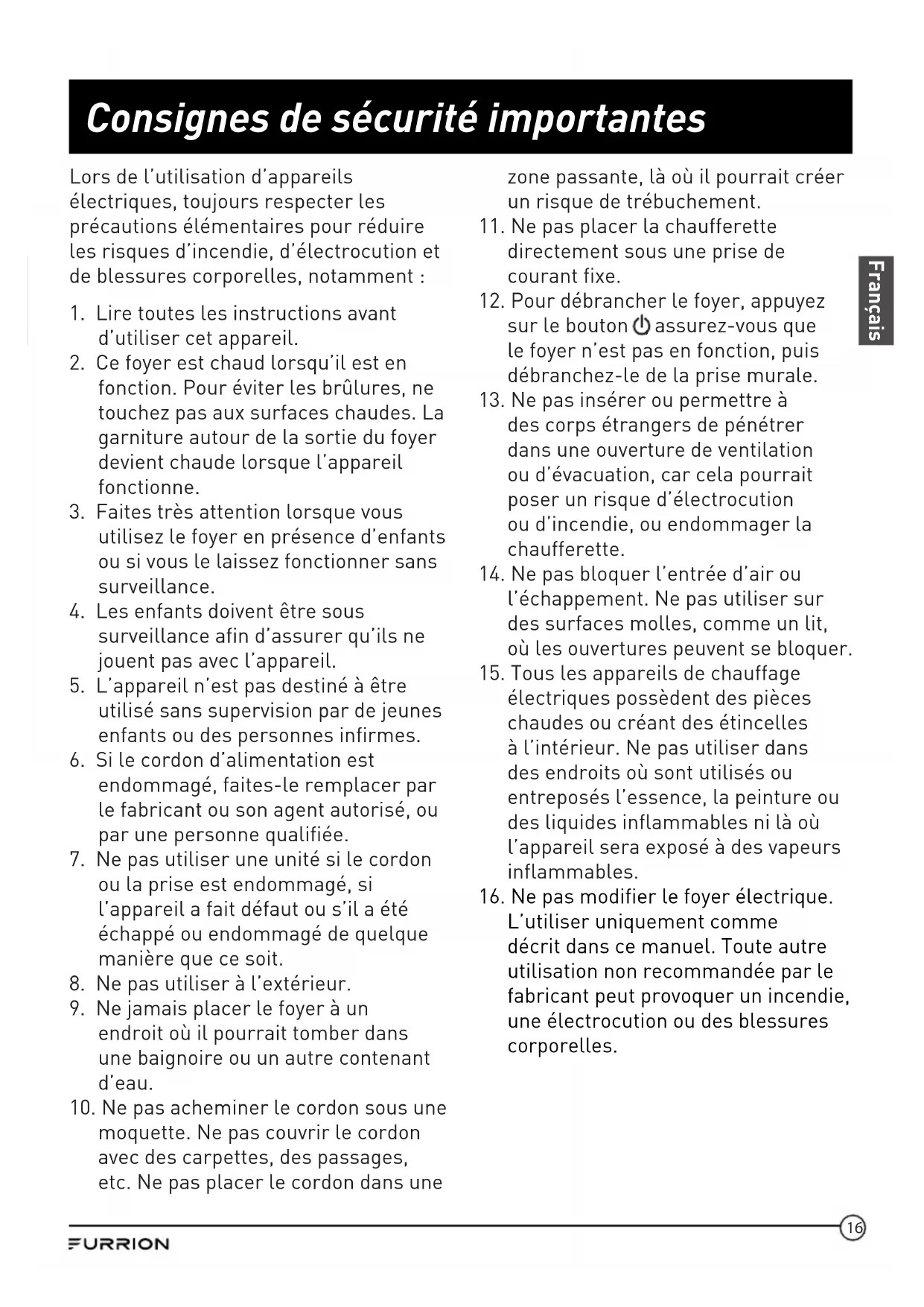 16. Ne pas modifier le foyer électrique.
