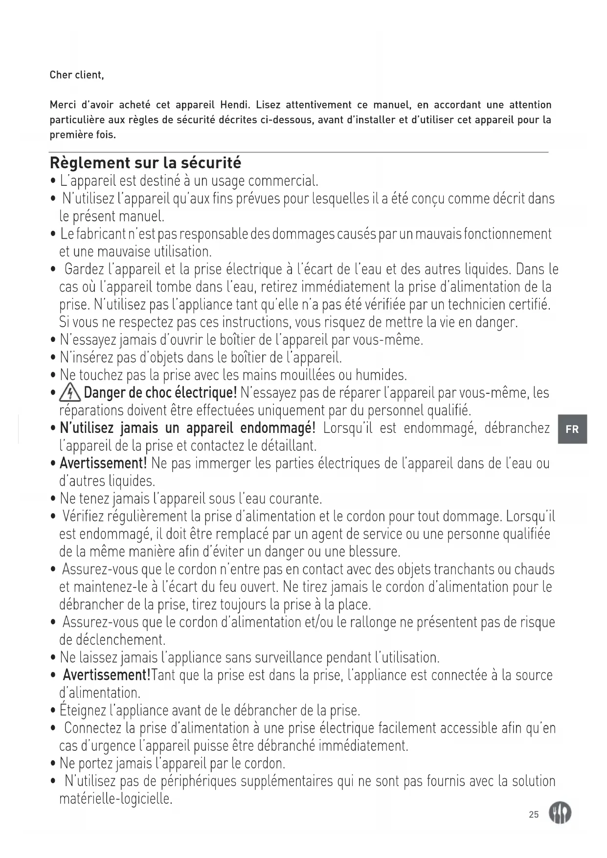 Cher client, Merci d’avoir acheté cet appareil Hendi. Lisez attentivement ce manuel, en accordant une attention particulière aux règles de sécurité décrites ci-dessous, avant d’installer et d’utiliser cet appareil pour la première fois. Règlement sur la sécurité
