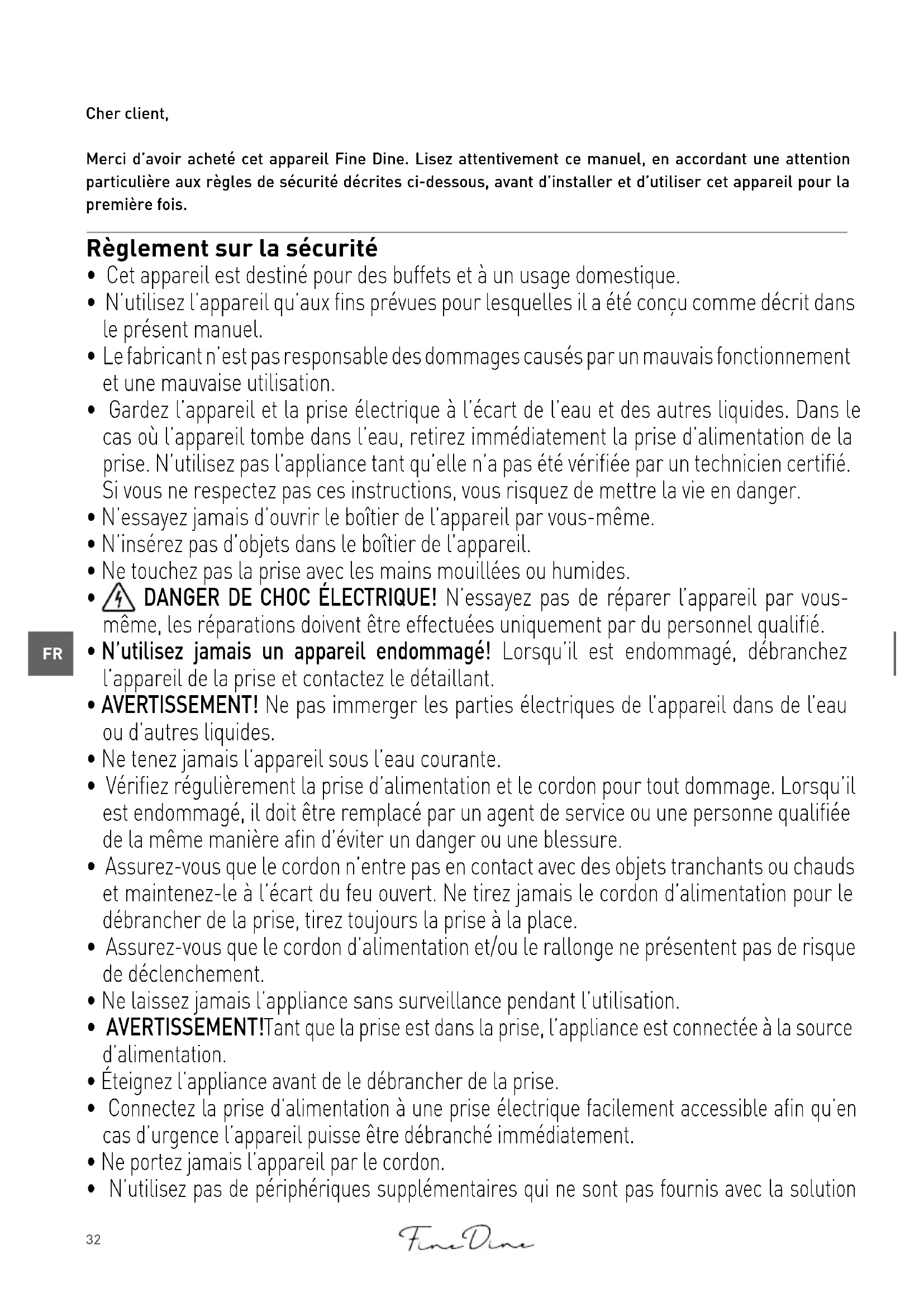 Cher client, Merci d’avoir acheté cet appareil Fine Dine. Lisez attentivement ce manuel, en accordant une attention particulière aux règles de sécurité décrites ci-dessous, avant d’installer et d’utiliser cet appareil pour la première fois. Règlement sur la sécurité