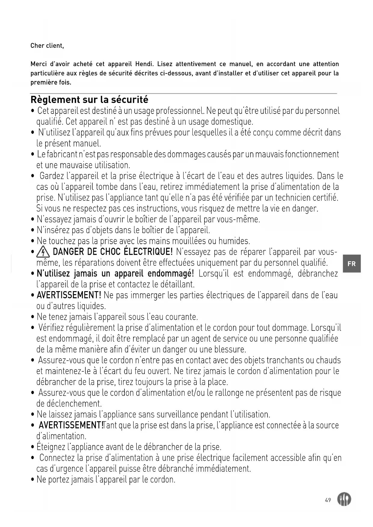 Cher client, Merci d’avoir acheté cet appareil Hendi. Lisez attentivement ce manuel, en accordant une attention particulière aux règles de sécurité décrites ci-dessous, avant d’installer et d’utiliser cet appareil pour la première fois. Règlement sur la sécurité