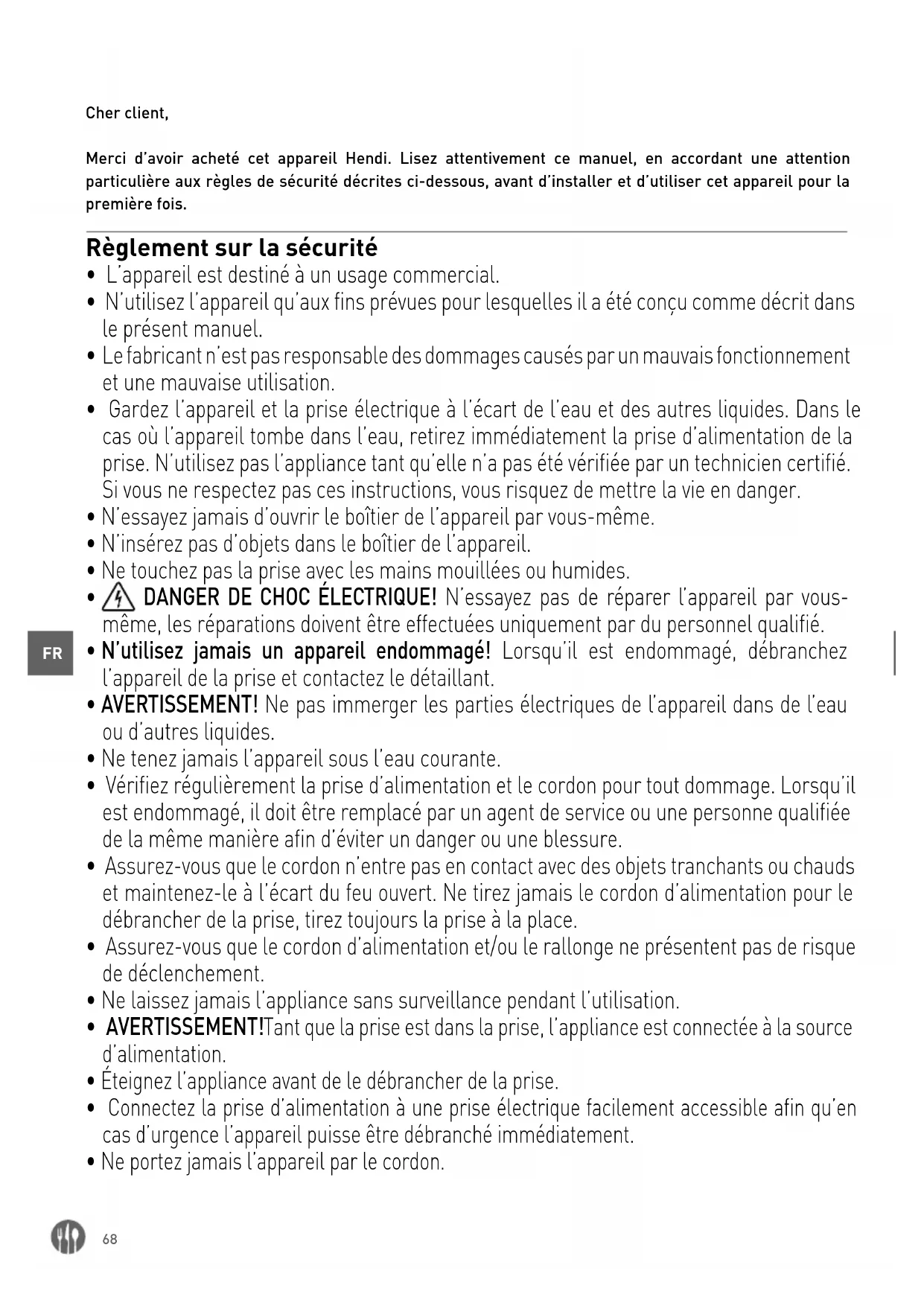 Merci d'avoir acheté cet appareil Hendi. Lisez attentivement ce manuel, en accordant une attention particulière aux règles de sécurité décrites ci-dessous, avant d'installer et d'utiliser cet appareil pour la première fois.