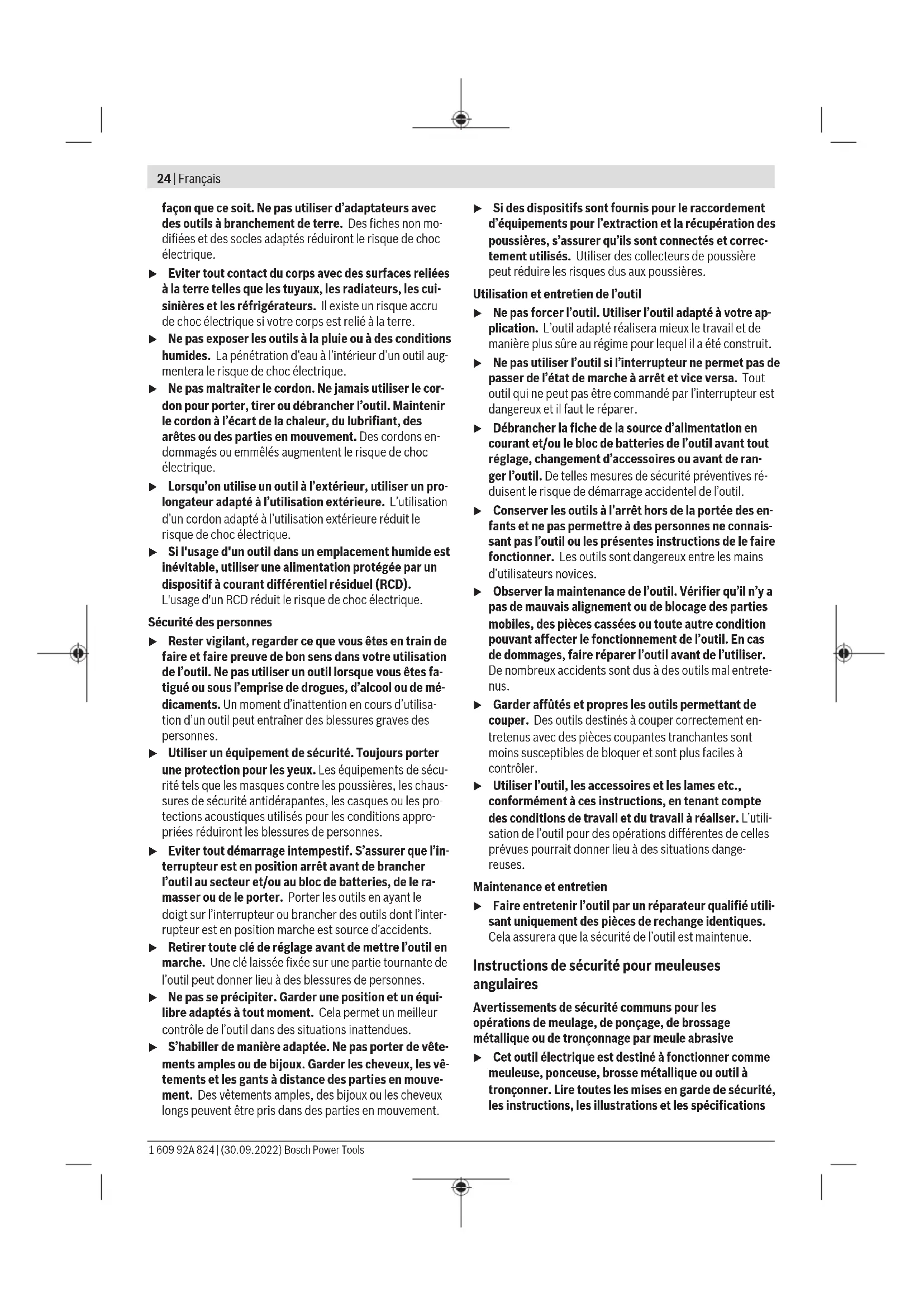 ] [m/s] 180 – – 6500 80 100 30 M14 8500 45 Dust/Chip Extraction The dust from materials such as lead paint, some types of wood, minerals and metal can be harmful to human health. Touching or breathing in this dust can trigger allergic reac- tions and/or cause respiratory illnesses in the user or in people in the near vicinity. Certain dusts, such as oak or beech dust, are classified as carcinogenic, especially in conjunction with wood treatment additives (chromate, wood preservative). Materials contain- ing asbestos may only be machined by specialists. – Use a dust extraction system that is suitable for the ma- terial wherever possible. – Provide good ventilation at the workplace. – It is advisable to wear a P2 filter class breathing mask. The regulations on the material being machined that apply in the country of use must be observed. u Avoid dust accumulation at the workplace. Dust can easily ignite. Operation Start-Up u Pay attention to the mains voltage. The voltage of the power source must match the voltage specified on the rating plate of the power tool. Power tools marked with 230V can also be operated with 220V. u Products that are only sold in AUS and NZ: Use a resid- ual current device (RCD) with a nominal residual current of 30 mA or less. When operating the power tool using a mobile generator that does not have sufficient reserve capacity or an adequate voltage control system with inrush current boost converter, loss of performance or atypical behaviour may occur upon switch-on. Please check the suitability of the power generator you are using, particularly with regard to the mains voltage and fre- quency. Switching on/off To start the power tool, push the on/off switch (2) forward and then press it down. To lock the on/off switch (2) in position, push the on/off switch (2) further forward. Bosch Power Tools 1 609 92A 824 | (30.09.2022)22 | English To switch off the power tool, release the on/off switch (2); or, if the switch is locked, briefly press the on/off switch (2) and then release it. Switch without locking mechanism (country-specific): To start the power tool, push the on/off switch (2) forward and then press it down. To switch off the power tool, release the on/off switch (2). u Always check abrasive tools before using them. The abrasive tool must be fitted properly and be able to move freely. Carry out a test run for at least one minute with no load. Do not use abrasive tools that are damaged, run untrue or vibrate during use. Damaged abrasive tools can burst apart and cause injuries. Restart protection (GWS2000J/GWS2200J/GWS2400J) The restart protection feature prevents the power tool from uncontrolled starting after the power supply to it has been interrupted. To restart the tool, set the on/off switch (2) to the "off" posi- tion and then switch the power tool on again. Soft start (GWS2000J/GWS2200J/GWS2400J) The electronic soft start limits the torque when the power tool is switched on and enables a smooth start-up. Note: If the power tool runs at full speed immediately after being switched on, this means that the soft start and restart protection mechanisms have failed. The power tool must be sent to the after-sales service immediately (see the "After- Sales Service and Application Service" section for ad- dresses). Working Advice u Pull the plug out of the socket before carrying out any work on the power tool. u Exercise caution when cutting slots in structural walls; see the "Information on structural design" section. u Clamp the workpiece if it is not secure under its own weight. u Do not load the power tool so heavily that it comes to a stop. u If the power tool has been subjected to a heavy load, continue to run it at no-load for several minutes to cool down the accessory. u Do not use the power tool with a cut-off stand. u Do not touch grinding and cutting discs until they have cooled down. The discs can become very hot while work- ing. Rough grinding u Never use cutting discs for rough grinding. The best rough grinding results are achieved with a set angle of 30° to 40°. Move the power tool back and forth with mod- erate pressure. This will ensure that the workpiece does not become too hot or discolour and that grooves are not formed. Flap Disc With the flap disc (accessory), curved surfaces and profiles can be worked. Flap discs have a considerably higher ser- vice life, lower noise levels and lower sanding temperatures than conventional sanding sheets. Cutting Metal u Always use the protective guard for cutting (14) when cutting with bonded abrasives. When carrying out abrasive cutting, use a moderate feed that is suited to the material being machined. Do not exert pressure on the cutting disc and do not tilt or swing the power tool. Do not attempt to reduce the speed of a cutting disc coming to a stop by applying pressure from the side. The power tool must always work in an up-grinding mo- tion. Otherwise, there is a risk that it will be pushed uncontrolled out of the cut. For best results when cut- ting profiles and rectangular tubing, start at the smallest cross section. Cutting stone u Provide sufficient dust extraction when cutting stone. u Wear a dust mask. u The power tool may be used only for dry cutting/grind- ing. For cutting stone, it is best to use a diamond cutting disc. When using the extraction guard for cutting with a cutting guide(23), the dust extractor must be approved for extract- ing stone dust. Suitable dust extractors are available from Bosch. Switch on the power tool and position it with the front part of the guide block on the workpiece. Move the power tool with a moderate feed motion that is suited to the material being machined. When cutting especially hard materials such as concrete with a high pebble content, the diamond cutting disc can overheat and become damaged as a result. This is clearly in- dicated by circular sparking, rotating with the diamond cut- ting disc. If this happens, stop cutting and allow the 