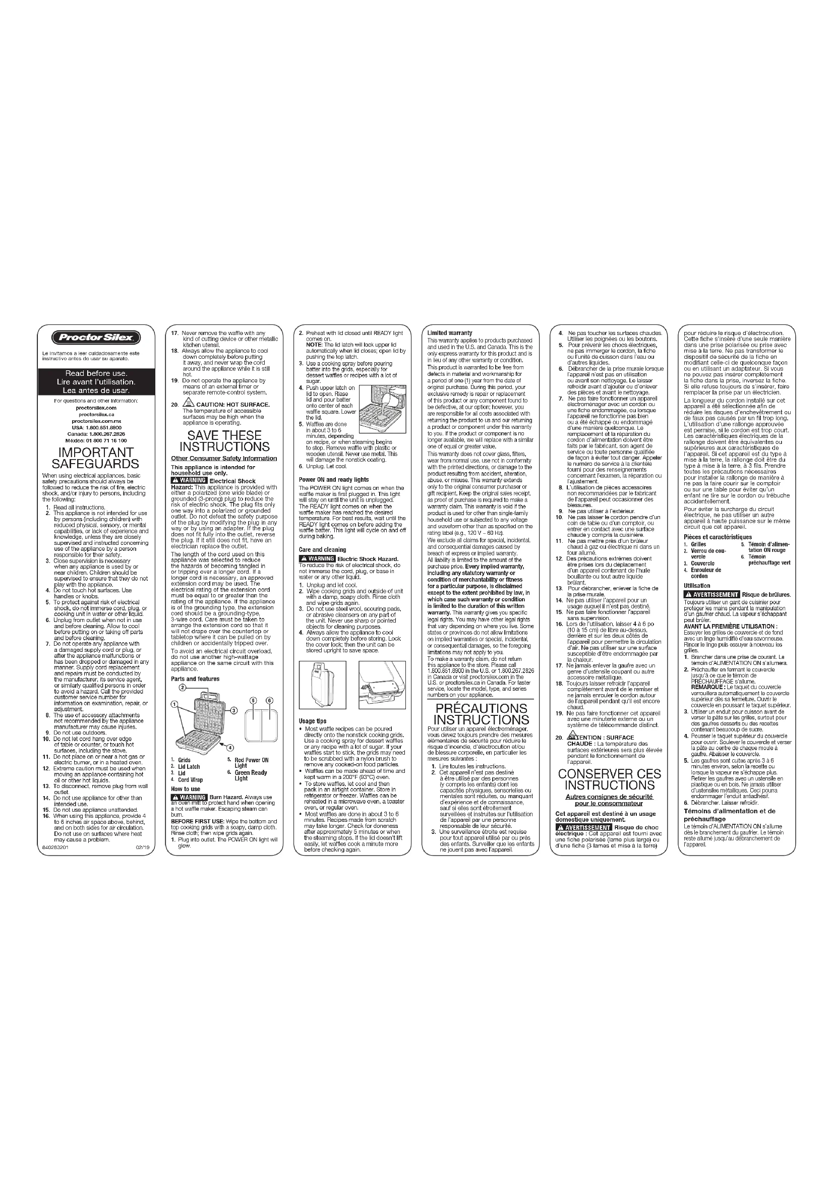 - La plupart des gaufres sont cuites après environ 3 à 6 minutes. Les recettes faites approximativement peuvent demander plus de temps. Vérifier si les gaufres sont cuites après environ 5 minutes. Les gaufres sont cuites lorsque la vapeur cesse de s’échapper. Si le couvercle ne se soulève pas facilement, laisser cuire les gaufres une minute de plus et vérifier à nouveau. Garantie limitée Cette garantie s’applique aux produits achetés et utilisées aux É.-U. et au Canada. C’est la seule garantie expresse pour ce produit et est en lieu et place de tout autre garantie ou condition. Ce produit est garanti contre tout défaut de matériaux et de main-d’oeuvre pour une période des un (1) an à compter de la date d’achat d’origine. Au cours de cette période, votre seul recours est la réparation ou le remplacement de ce produit ou tout composant s’avérant défectueux, à notre gré, mais vous êtes responsable de tous les coûts liés à l’expédition du produit et le retour d’un produit ou d’un composant dans le cadre de cette garantie. Si le produit ou un composant n’est plus offert, nous le remplacerons par un produit similaire de valeur égale ou supérieure. Le témoin de PRÉCHAUFFAGE s’allume dès que le gaufrier a atteint la température de réglage désirée. Pour des résultats optimaux, attendre que le témoin de PRÉCHAUFFAGE s’allume avant de verser la pâte à gaufre. Ce témoin s’éteindra et s’allumera pendant le cycle de cuisson. Cette garantie ne couvre pas le verre, les filtres, l’usure d’un usage normal, l’utilisation non conforme aux directives imprimées, ou des dommages au produit résultant d’un accident, modification, utilisation abusive ou incorrecte. Cette garantie s’applique seulement à l’acheteur original ou à la personne l’ayant reçu en cadeau. La présentation du reçu de vente d’origine comme preuve d’achat est nécessaire pour faire une réclamation au titre de cette garantie. Cette garantie s’annule si le produit est utilisé autrement que par une famille ou si l’appareil est soumis à toute tension ou forme d’onde différente des caractéristiques nominales précisées sur l’étiquette (par ex. : 120 V ~ 60 Hz). Nous excluons toutes les réclamations au titre de cette garantie pour les dommages spéciaux, consécutifs et indirects causés par la violation de garantie expresse ou implicite. Toute responsabilité est limitée au prix d’achat. Chaque garantie implicite, y compris toute garantie ou condition de qualité marchande ou d’adéquation à un usage particulier, est exonérée, sauf dans la mesure interdite par la loi, auquel cas la garantie ou condition est limitée à la durée de cette garantie écrite.Cette garantie vous donne des droits légaux précis. Vous pouvez avoir d’autres droits qui varient selon l’endroit où vous habitez. Certaines provinces ne permettent pas les limitations sur les garanties implicites ou les dommages spéciaux ou indirects de telle sorte que les limitations ci-dessus ne s’appliquent peut-être pas à votre cas. Ne pas retourner cet appareil au magasin lors d’une réclamation au titre de cette garantie. Téléphoner au 1.800.851.8900 aux É.-U. ou au 1.800.267.2826 au Canada ou visiter le site internet www.proctorsilex.com aux É.-U. ou www.proctorsilex.ca au Canada. Pour un service plus rapide, trouvez le numéro de modèle, le type d’appareil et les numéros de série sur votre appareil. SALVAGUARDIAS IMPORTANTES Cuando utilice artefactos eléctricos, siempre deben seguirse precauciones de seguridad básicas a fin de reducir el riesgo de incendio, descarga eléctrica, y/o lesiones a personas, incluyendo las siguientes: