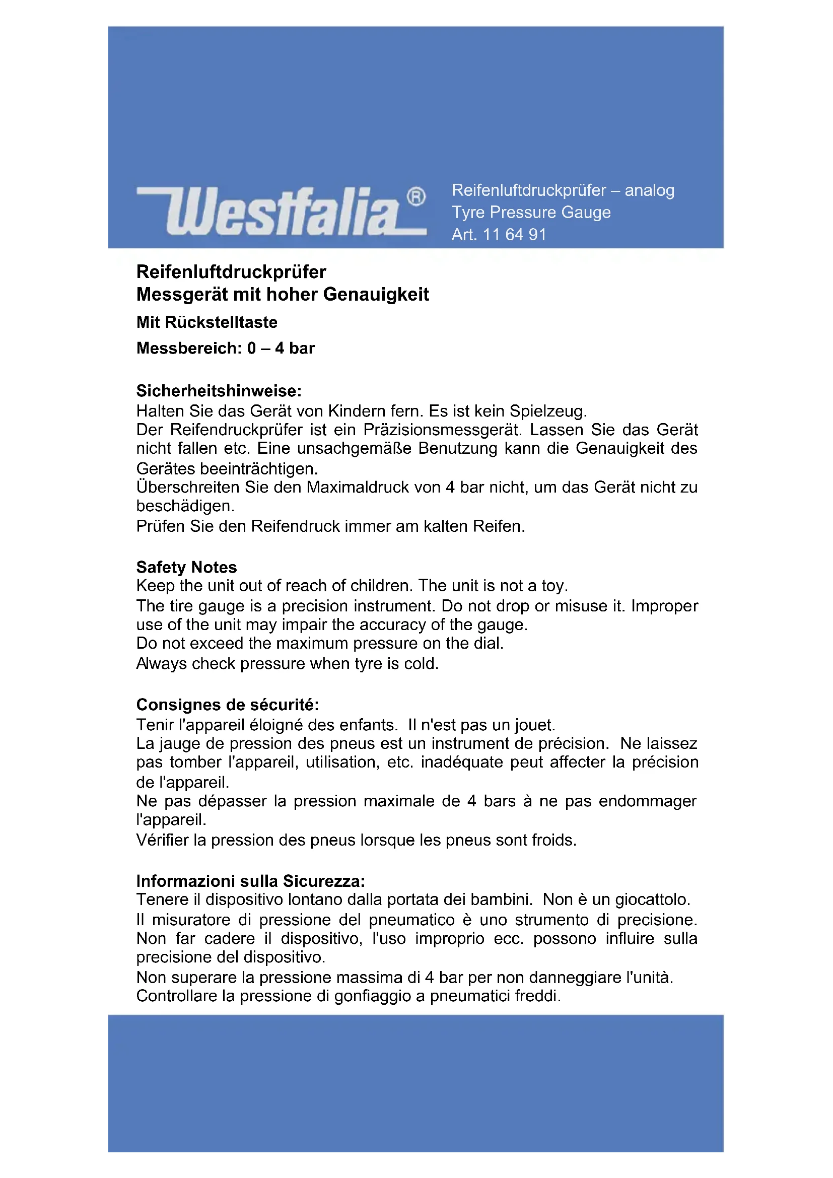 lways check pressure when tyre is cold. Consignes de sécurité: Tenir l'appareil éloigné des enfants. Il n'est pas un jouet. La jauge de pression des pneus est un instrument de précision. Ne laissez pas tomber l'appareil, utilisation, etc. inadéquate peut affecter la précision de l'appareil. Ne pas dépasser la pression maximale de 4 bars à ne pas endommage