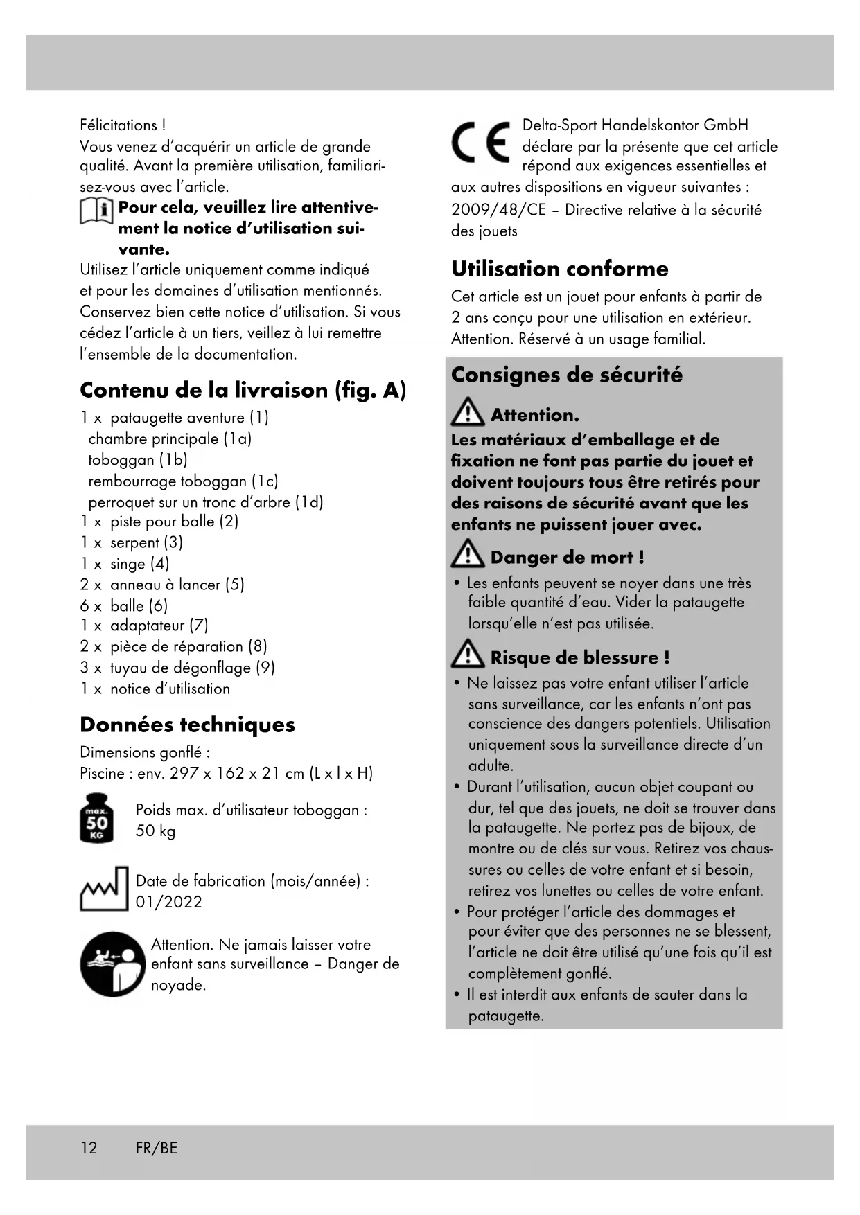 positionnez-la sur la zone endommagée et pressez fermement dessus. Stockage, nettoyage Changez régulièrement l’eau de l’article, en par- ticulier par temps de canicule et lorsque l’eau est sale ! Lorsque vous n’utilisez pas l’article, rangez-le toujours non gonflé, sec, propre et à une température ambiante. Les valves doivent toujours être fermées pendant le stockage. Ne nettoyer qu’avec de l’eau ou de l’eau savon- neuse, jamais avec des produits de nettoyage agressifs. Lors du stockage hivernal, ne placer aucun objet pointu sur le produit et ne pas pulvériser de talc. Mise au rebut Éliminez l‘article et le matériel d‘emballage conformément aux directives locales en vigueur. Le matériel d‘emballage tel que les sachets en plastique par exemple ne doivent pas arriver dans les mains des enfants. Conservez le maté- riel d‘emballage hors de portée des enfants. Ce produit est recyclable. Il est soumis à la responsabilité élargie du fabricant et est collecté séparément. Éliminez les produits et les emballages dans le respect de l‘environnement. Le code de recyclage est utilisé pour identifier les différents matériaux pour le retour dans le circuit de recyclage. Le code se compose du symbole de recyclage, qui doit correspondre au circuit de recyclage, et d‘un numéro identifiant le matériau. Indications concernant la garantie et le service après- vente L’article a été produit avec grand soin et sous un contrôle constant. DELTA-SPORT HANDELS- KONTOR GmbH accorde au client final privé une garantie de trois ans sur cet article à comp- ter de la date d’achat (période de garantie) conformément aux dispositions suivantes. La garantie ne vaut que pour les défauts de maté- riaux et de fabrication. La garantie ne couvre pas les pièces soumises à une usure normale, lesquelles doivent donc être considérées comme des pièces d’usure (comme par ex. les piles), de même qu’elle ne couvre pas les pièces fragiles, telles que les interrupteurs, les batteries ou les pièces fabriquées en verre. Les réclamations au titre de cette garantie sont exclues si l’article a été utilisé de manière abusive ou inappropriée, hors du cadre de son usage ou du champ d’application prévu ou si les instructions de la notice d’utilisation n’ont pas été respectées, à moins que le client final ne prouve que l´article présentait un défaut de matériau ou de fabrication n´étant pas dû à l’une des conditions mentionnées ci-dessus. Les réclamations au titre de la garantie ne peuvent être adressées pendant la période de garantie qu’en présentant le ticket de caisse original. Veuillez pour cela conserver le ticket de caisse original. Ceci s’applique également aux pièces remplacées et réparées. Si vous avez des plaintes à formuler, veuillez d’abord contacter le service d’assistance téléphonique ci-dessous ou nous contacter par courrier électronique. Si le cas est couvert par la garantie, nous nous engageons - à notre appréciation - à réparer ou à remplacer l’article gratuitement pour vous ou à vous rembourser le prix d’achat. Aucun autre droit ne découle de la garantie. Vos droits légaux, en particulier les droits de garantie contre le vendeur concerné, ne sont pas limités par cette garantie.16 FR/BE Article L217-16 du Code de la consommation Lorsque l‘acheteur demande au vendeur, pendant le cours de la garantie commerciale qui lui a été consentie lors de l‘acquisition ou de la réparation d‘un bien meuble, une remise en état couverte par la garantie, toute période d‘immo- bilisation d‘au moins sept jours vient s‘ajouter à la durée de la garantie qui restait à courir. Cette période court à compter de la demande d‘intervention de l‘acheteur ou de la mise à disposition pour réparation du bien en cause, si cette mise à disposition est postérieure à la demande d‘intervention. Indépendamment de la garantie commerciale souscrite, le vendeur reste tenu des défauts de conformité du bien et des vices rédhibitoires dans les conditions prévues aux articles L217-4 à L217-13 du Code de la consommation et aux articles 1641 à 1648 et 2232 du Code Civil. Article L217-4 du Code de la consommation Le vendeur livre un bien conforme au contrat et répond des défauts de conformité existant lors de la délivrance. Il répond également des défauts de conformité résultant de l‘emballage, des instructions de montage ou de l‘installation lorsque celle-ci a été mise à sa charge par le contrat ou a été réalisée sous sa responsabilité. Article L217-5 du Code de la consommation Le bien est conforme au contrat : 1° S´il est propre à l‘usage habituellement attendu d‘un bien semblable et, le cas échéant :