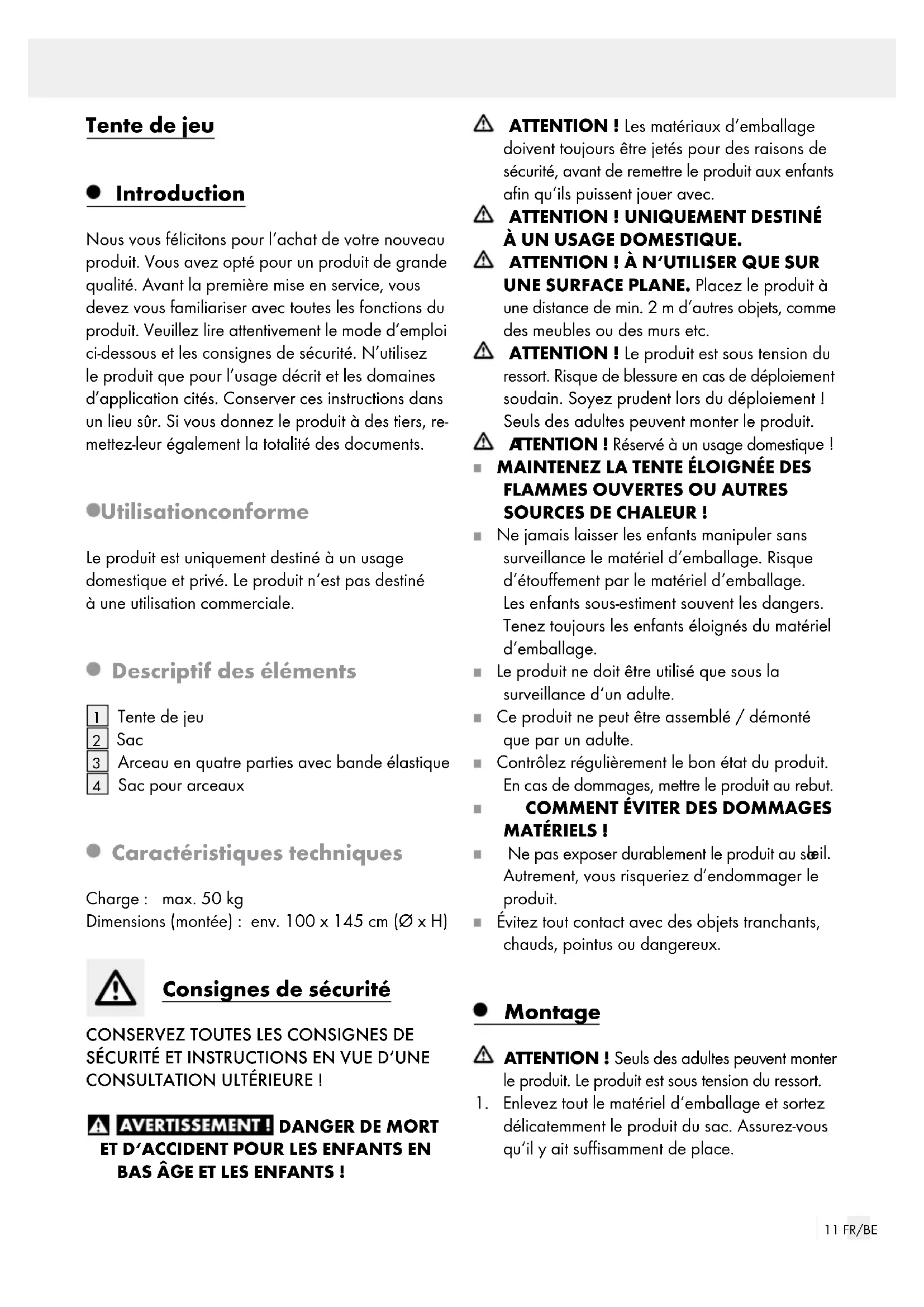 Démontage et rangement Retirez les arceaux du produit. Repliez le produit et rangez le das le sac (ill. D). Nettoyage Nettoyez uniquement l’extérieur du produit, à l’aide d’un chiffon doux et humide. Mise au rebut L’emballage se compose de matières recyclables pouvant être mises au rebut dans les déchetteries locales. Le produit est recyclable, soumis à la responsabilité élargie du fabricant et collecté séparément. Votre mairie ou votre municipalité vous renseigneront sur les possibilités de mise au rebut des produits usagés. Garantie Article L217-16 du Code de la consommation Lorsque l‘acheteur demande au vendeur, pendant le cours de la garantie commerciale qui lui a été consentie lors de l‘acquisition ou de la réparation d‘un bien meuble, une remise en état couverte par la garantie, toute période d‘immobilisation d‘au moins sept jours vient s‘ajouter à la durée de la garantie qui restait à courir. Cette période court à compter de la demande d‘intervention de l‘acheteur ou de la mise à disposition pour réparation du bien en cause, si cette mise à disposition est postérieure à la demande d‘intervention. Indépendamment de la garantie commerciale sous- crite, le vendeur reste tenu des défauts de conformité du bien et des vices rédhibitoires dans les conditions prévues aux articles L217-4 à L217-13 du Code de la consommation et aux articles 1641 à 1648 et 2232 du Code Civil. Article L217-4 du Code de la consommation Le vendeur livre un bien conforme au contrat et ré- pond des défauts de conformité existant lors de la délivrance. Il répond également des défauts de conformité ré- sultant de l‘emballage, des instructions de montage ou de l‘installation lorsque celle-ci a été mise à sa charge par le contrat ou a été réalisée sous sa res- ponsabilité. Article L217-5 du Code de la consommation Le bien est conforme au contrat : 1° S´il est propre à l‘usage habituellement attendu d‘un bien semblable et, le cas échéant : - s‘il correspond à la description donnée par le vendeur et posséder les qualités que celui-ci a présentées à l‘acheteur sous forme d‘échantil- lon ou de modèle ; - s‘il présente les qualités qu‘un acheteur peut légitimement attendre eu égard aux déclara- tions publiques faites par le vendeur, par le producteur ou par son représentant, notam- ment dans la publicité ou l‘étiquetage ;13 FR/BE 2° Ou s‘il présente les caractéristiques définies d‘un commun accord par les parties ou être propre à tout usage spécial recherché par l‘acheteur, porté à la connaissance du vendeur et que ce dernier a accepté. Article L217-12 du Code de la consommation L‘action résultant du défaut de conformité se prescrit par deux ans à compter de la délivrance du bien. Article 1641 du Code civil Le vendeur est tenu de la garantie à raison des défauts cachés de la chose vendue qui la rendent impropre à l‘usage auquel on la destine, ou qui diminuent tellement cet usage que l‘acheteur ne l‘aurait pas acquise, ou n‘en aurait donné qu‘un moindre prix, s‘il les avait connus. Article 1648 1er alinéa du Code civil L‘action résultant des vices rédhibitoires doit être in- tentée par l‘acquéreur dans un délai de deux ans à compter de la découverte du vice. Les pièces détachées indispensables à l’utilisation du produit sont disponibles pendant la durée de la garantie du produit. Le produit a été fabriqué selon des critères de qua- lité stricts et contrôlé consciencieusement avant sa livraison. En cas de défaillance, vous êtes en droit de retourner ce produit au vendeur. La présente ga- rantie ne constitue pas une restriction de vos droits légaux. Ce produit bénéficie d‘une garantie de 3 ans à compter de sa date d’achat. La durée de garantie débute à la date d’achat. Veuillez conserver le ticket de caisse original. Il fera office de preuve d’achat. Si un problème matériel ou de fabrication devait survenir dans 3 ans suivant la date d‘achat de ce produit, nous assurons à notre discrétion la répara- tion ou le remplacement du produit sans frais sup- plémentaires. La garantie prend fin si le produit est endommagé suite à une utilisation inappropriée ou à un entretien défaillant. La garantie couvre les vices matériels et de fabrica- tion. Cette garantie ne s’étend ni aux pièces du produit soumises à une usure normale (p. ex. des piles) et qui, par conséquent, peuvent être considé- rées comme des pièces d’usure, ni aux dommages sur des composants fragiles, comme des interrupteurs, des batteries ou des éléments fabriqués en verre. Faire valoir sa garantie Pour garantir la rapidité d’exécution de la procé- dure de garantie, veuillez respecter les indications suivantes : Veuillez conserver le ticket de caisse et la référence du produit (par ex. IAN 123456_7890) à titre de preuve d’achat pour toute demande. Le numéro de référence de l’article est indiqué sur la plaque d’identification, gravé sur la page de titre de votre manuel (en bas à gauche) ou sur un auto- collant apposé sur la face arrière ou inférieure du produit. En cas de dysfonctionnement du produit, ou de tout autre défaut, contactez en premier lieu le service après-vente par téléphone ou par e-mail aux coor- données indiquées ci-dessous. Vous pouvez alors envoyer franco de port tout produit considéré comme défectueux au service clientèle indiqué, accompagné de la preuve d’achat (ticket de caisse) et d’une description écrite du défaut avec mention de sa date d’apparition. Service après-vente Service après-vente France Tél. : 0800904879 E-Mail : owim@lidl.fr Service après-vente Belgique Tél. : 080071011 Tél. : 80023970 (Luxembourg) E-Mail : owim@lidl.be14 NL/BE Speeltent Inleiding Hartelijk gefeliciteerd met de aankoop van uw nieuwe product. U hebt voor een hoogwaardig product ge- kozen. Maa