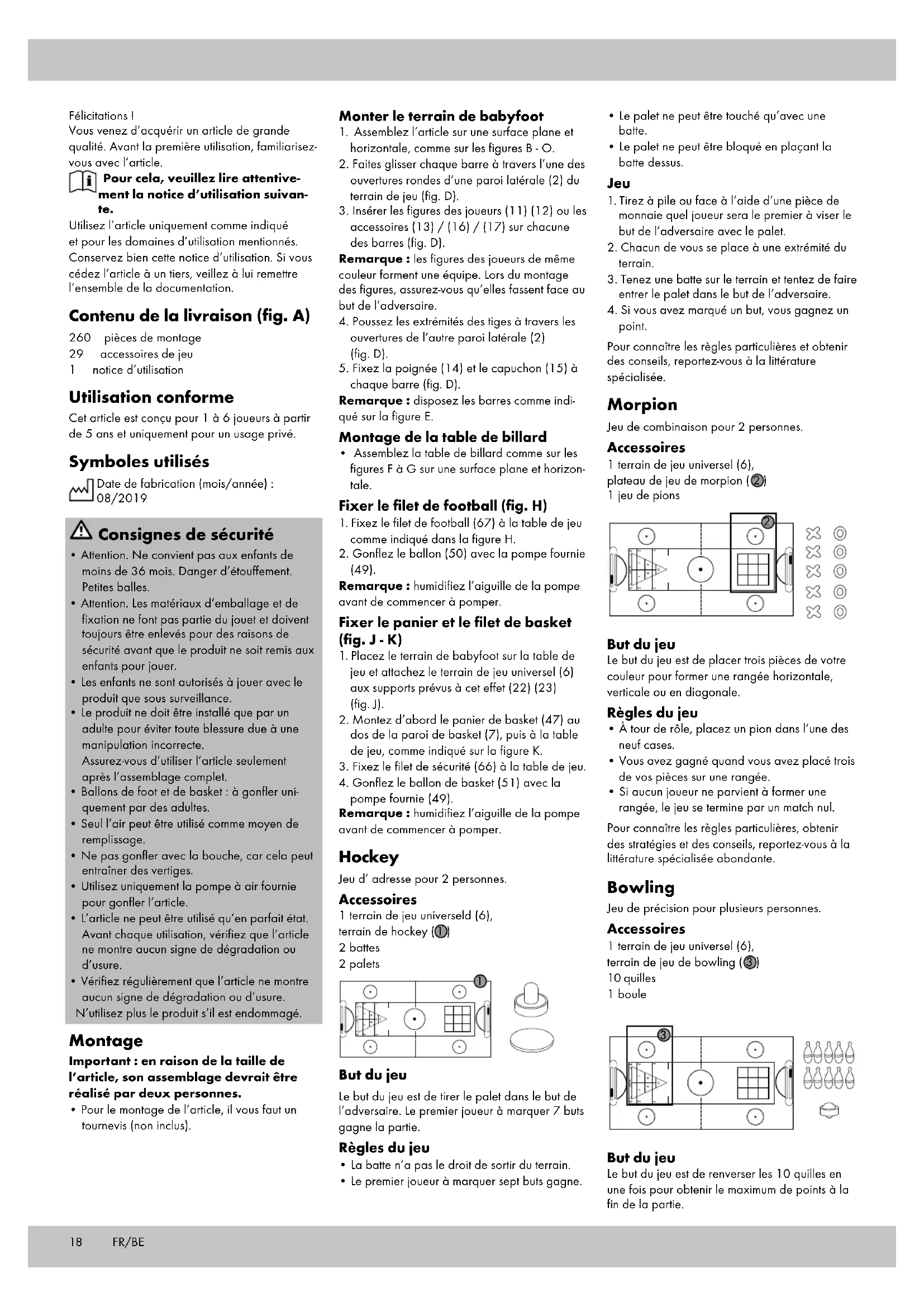 - s‘il présente les qualités qu‘un acheteur peut légitimement attendre eu égard aux déclarations publiques faites par le vendeur, par le producteur ou par son représentant, notamment dans la publicité ou l‘étiquetage ; 2° Ou s‘il présente les caractéristiques définies d‘un commun accord par les parties ou être propre à tout usage spécial recherché par l‘acheteur, porté à la connaissance du vendeur et que ce dernier a accepté. Article L217-12 du Code de la consommation L‘action résultant du défaut de conformité se prescrit par deux ans à compter de la délivrance du bien. Article 1641 du Code civil Le vendeur est tenu de la garantie à raison des défauts cachés de la chose vendue qui la ren- dent impropre à l‘usage auquel on la destine, ou qui diminuent tellement cet usage que l‘acheteur ne l‘aurait pas acquise, ou n‘en aurait donné qu‘un moindre prix, s‘il les avait connus. Article 1648 1er alinéa du Code civil L‘action résultant des vices rédhibitoires doit être intentée par l‘acquéreur dans un délai de deux ans à compter de la découverte du vice. Les pièces détachées indispensables à l’utilisation du produit sont disponibles pendant la durée de la garantie du produit. IAN : 322143_1901 Service France Tel. : 0800 919270 E-Mail : deltasport@lidl.fr Service Belgique Tel. : 070 270 171 (0,15 EUR/Min.) E-Mail : deltasport@lidl.be24 Gefeliciteerd! Met uw aankoop hebt u voor een hoogwaardig artikel gekozen. Zorg ervoor dat u voor het eers- te gebruik met het artikel vertrouwd raakt. Lees hiervoor de volgende gebru- iksaanwijzing zorgvuldig door. Gebruik het artikel alleen zoals omschreven en voor het aangegeven doel. Bewaar deze gebru- iksaanwijzing goed. Geef alle documenten mee als u het artikel aan iemand anders geeft. In het leveringspakket inbe- grepen (afb. A) 260 x onderdeel montage 29 x spelaccessoires 1 x gebruiksaanwijzing Voorgeschreven gebruik Dit artikel is voor 1 - 6 speler(s) met een leeftijd vanaf 5 jaar en uitsluitend voor privégebruik bestemd. Gebruikte symbolen Productiedatum (maand/jaar): 08/2019 Veiligheidsinstructies