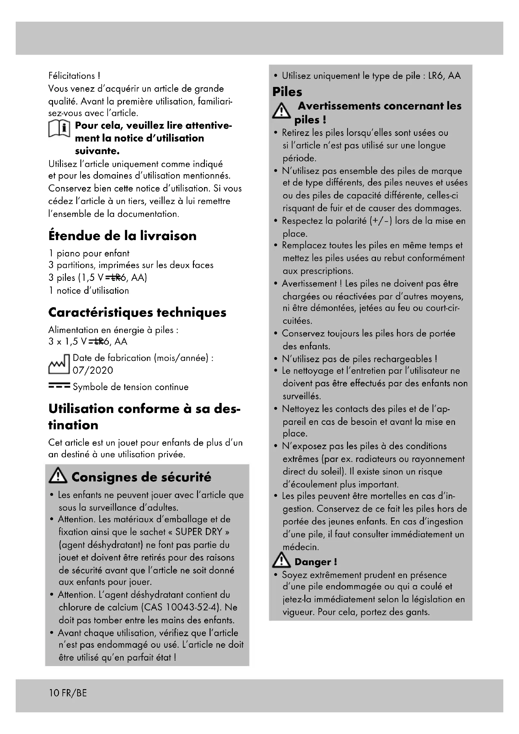 1 piano pour enfant 3 partitions, imprimées sur les deux faces 3 piles (1,5 V=R6, AA) 1 notice d'utilisation