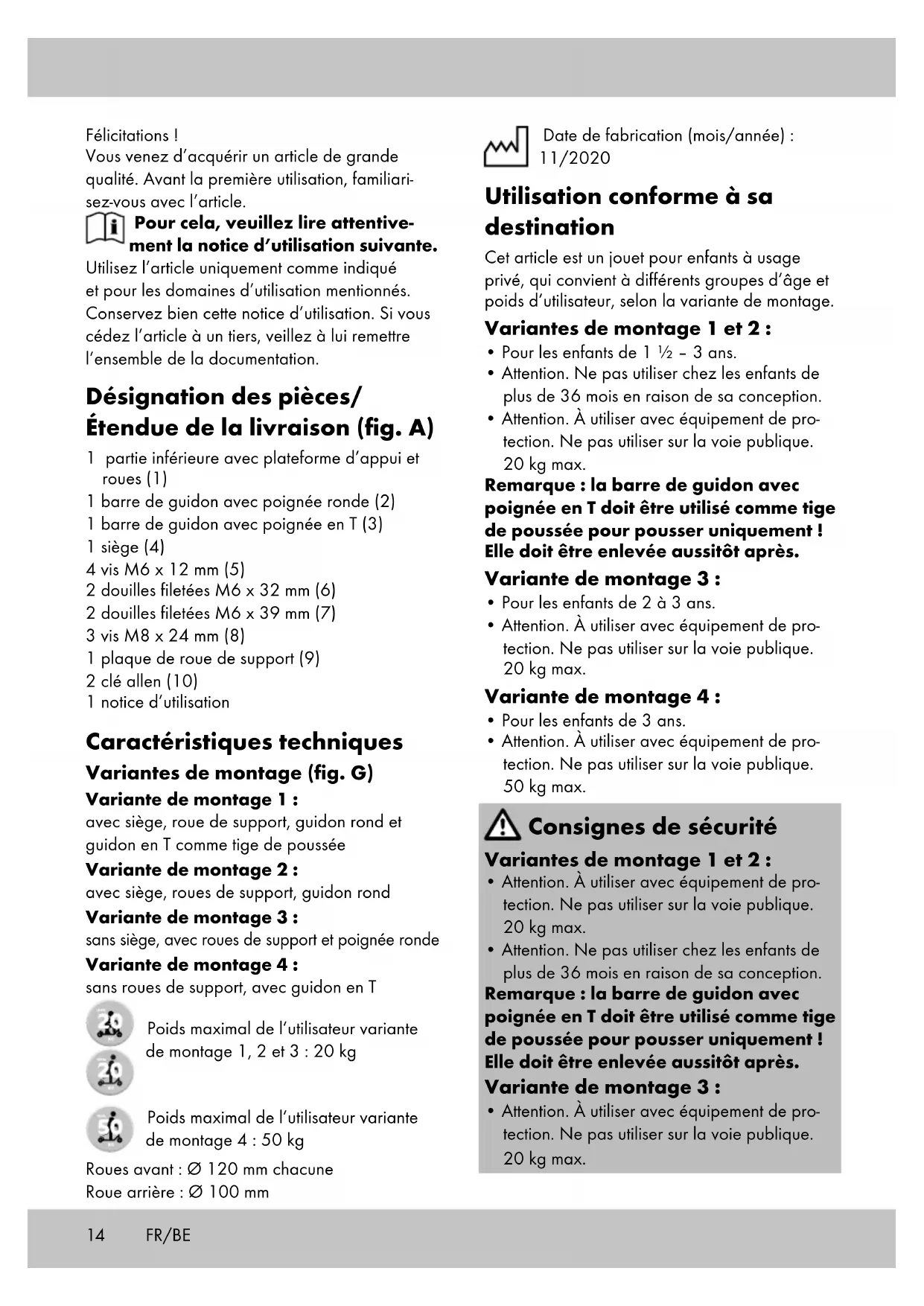 the screws.13GB/IE Any repairs under the warranty, statutory guar- antees or through goodwill do not extend the warranty period. This also applies to replaced and repaired parts. Repairs after the warranty are subject to a charge. IAN: 346311_2004 Service Great Britain Tel.: 0800 404 7657 E-Mail: deltasport@lidl.co.uk Service Ireland Tel.: 1890 930 034 (0,08 EUR/Min., (peak)) (0,06 EUR/Min., (off peak)) E-Mail: deltasport@lidl.ie14 Félicitations ! Vous venez d’acquérir un article de grande qualité. Avant la première utilisation, familiari- sez-vous avec l’article. Pour cela, veuillez lire attentive- ment la notice d’utilisation suivante. Utilisez l’article uniquement comme indiqué et pour les domaines d’utilisation mentionnés. Conservez bien cette notice d’utilisation. Si vous cédez l’article à un tiers, veillez à lui remettre l’ensemble de la documentation. Désignation des pièces/ Étendue de la livraison (fig. A) 1 partie inférieure avec plateforme d’appui et roues (1) 1 barre de guidon avec poignée ronde (2) 1 barre de guidon avec poignée en T (3) 1 siège (4) 4 vis M6 x 12 mm (5) 2 douilles filetées M6 x 32 mm (6) 2 douilles filetées M6 x 39 mm (7) 3 vis M8 x 24 mm (8) 1 plaque de roue de support (9) 2 clé allen (10) 1 notice d’utilisation Caractéristiques techniques Variantes de montage (fig. G) Variante de montage 1 : avec siège, roue de support, guidon rond et guidon en T comme tige de poussée Variante de montage 2 : avec siège, roues de support, guidon rond Variante de montage 3 : sans siège, avec roues de support et poignée ronde Variante de montage 4 : sans roues de support, avec guidon en T Poids maximal de l’utilisateur variante de montage 1, 2 et 3 : 20 kg Poids maximal de l’utilisateur variante de montage 4 : 50 kg Roues avant : Ø 120 mm chacune Roue arrière : Ø 100 mm Date de fabrication (mois/année) : 11/2020 Utilisation conforme à sa destination Cet article est un jouet pour enfants à usage privé, qui convient à différents groupes d’âge et poids d’utilisateur, selon la variante de montage. Variantes de montage 1 et 2 :