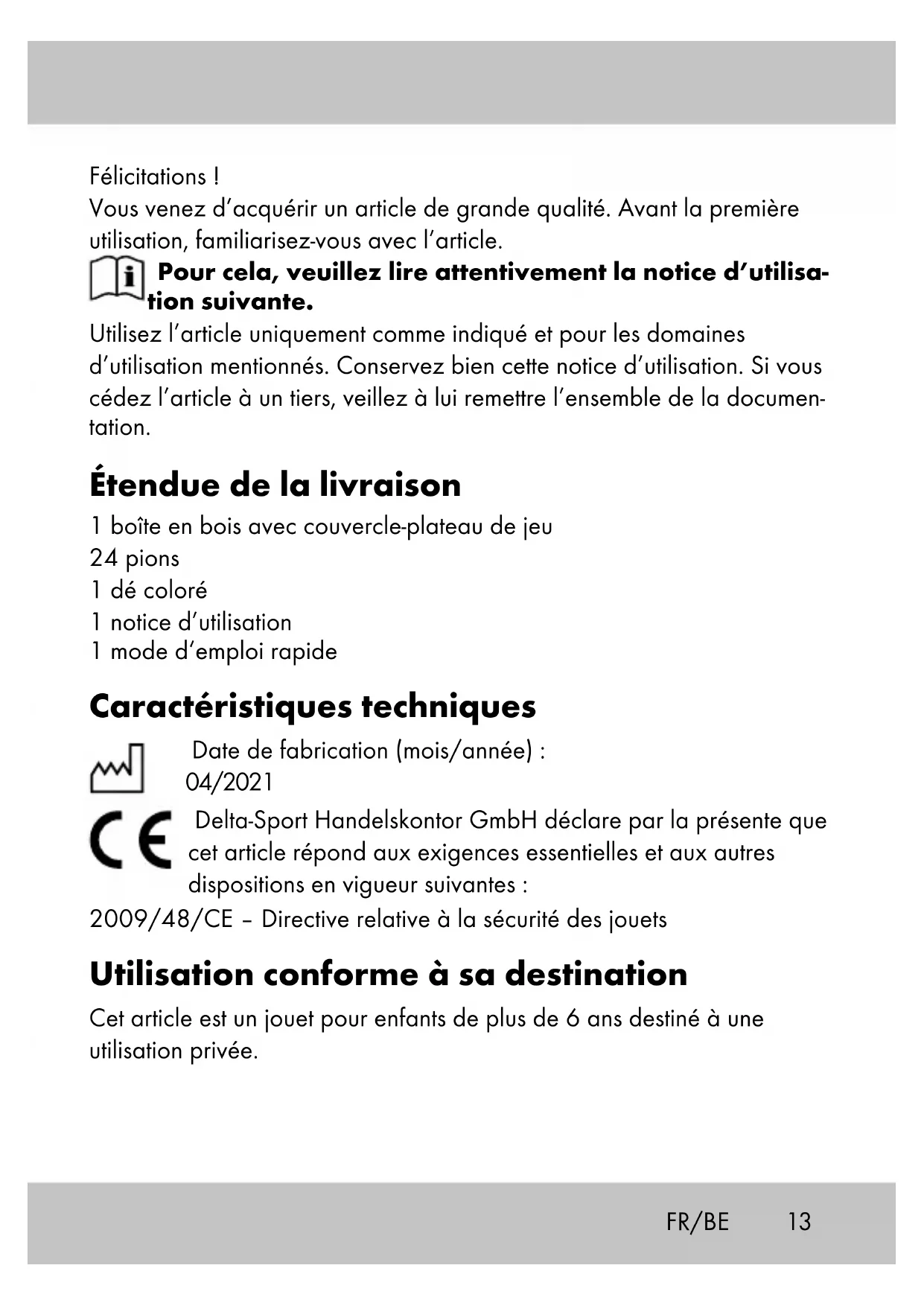 - s‘il présente les qualités qu‘un acheteur peut légitimement attendre eu égard aux déclarations publiques faites par le vendeur, par le producteur ou par son représentant, notamment dans la publicité ou l‘étiquetage ; 2° Ou s‘il présente les caractéristiques définies d‘un commun accord par les parties ou être propre à tout usage spécial recherché par l‘acheteur, porté à la connaissance du vendeur et que ce dernier a accepté. Article L217-12 du Code de la consommation L‘action résultant du défaut de conformité se prescrit par deux ans à compter de la délivrance du bien.18 FR/BE Article 1641 du Code civil Le vendeur est tenu de la garantie à raison des défauts cachés de la chose vendue qui la rendent impropre à l‘usage auquel on la destine, ou qui diminuent tellement cet usage que l‘acheteur ne l‘aurait pas acquise, ou n‘en aurait donné qu‘un moindre prix, s‘il les avait connus. Article 1648 1er alinéa du Code civil L‘action résultant des vices rédhibitoires doit être intentée par l‘acquéreur dans un délai de deux ans à compter de la découverte du vice. Les pièces détachées indispensables à l’utilisation du produit sont dispo- nibles pendant la durée de la garantie du produit. IAN : 364364_2010 Service France Tel. : 0800 919270 E-Mail : deltasport@lidl.fr Service Belgique Tel. : 070 270 171 (0,15 EUR/Min.) E-Mail : deltasport@lidl.be19 Gefeliciteerd! Met uw aankoop hebt u voor een hoogwaardig artikel gekozen. Zorg ervoor dat u voor het eerste gebruik met het artikel vertrouwd raakt. Lees hiervoor de volgende gebruiksaanwijzing zorgvuldig door. Gebruik het artikel alleen zoals omschreven en voor het aangegeven doel. Bewaar deze gebruiksaanwijzing goed. Geef alle documenten mee als u het artikel aan iemand anders geeft. Leveringsomvang 1 x houten doos met deksel als speelbord 24 x pion 1 x kleurendobbelsteen 1 x gebruiksaanwijzing 1 x korte handleiding Technische gegevens Productiedatum (maand/jaar): 04/2021 Hierbij verklaart Delta-Sport Handelskontor GmbH dat dit artikel voldoet aan de volgende basiseisen en de overige ter zake doende bepalingen: 2009/48/EG – Speelgoedrichtlijn Beoogd gebruik Dit artikel is speelgoed voor kinderen vanaf 6 jaar oud voor particulier gebruik. NL/BE20 Veiligheidstips
