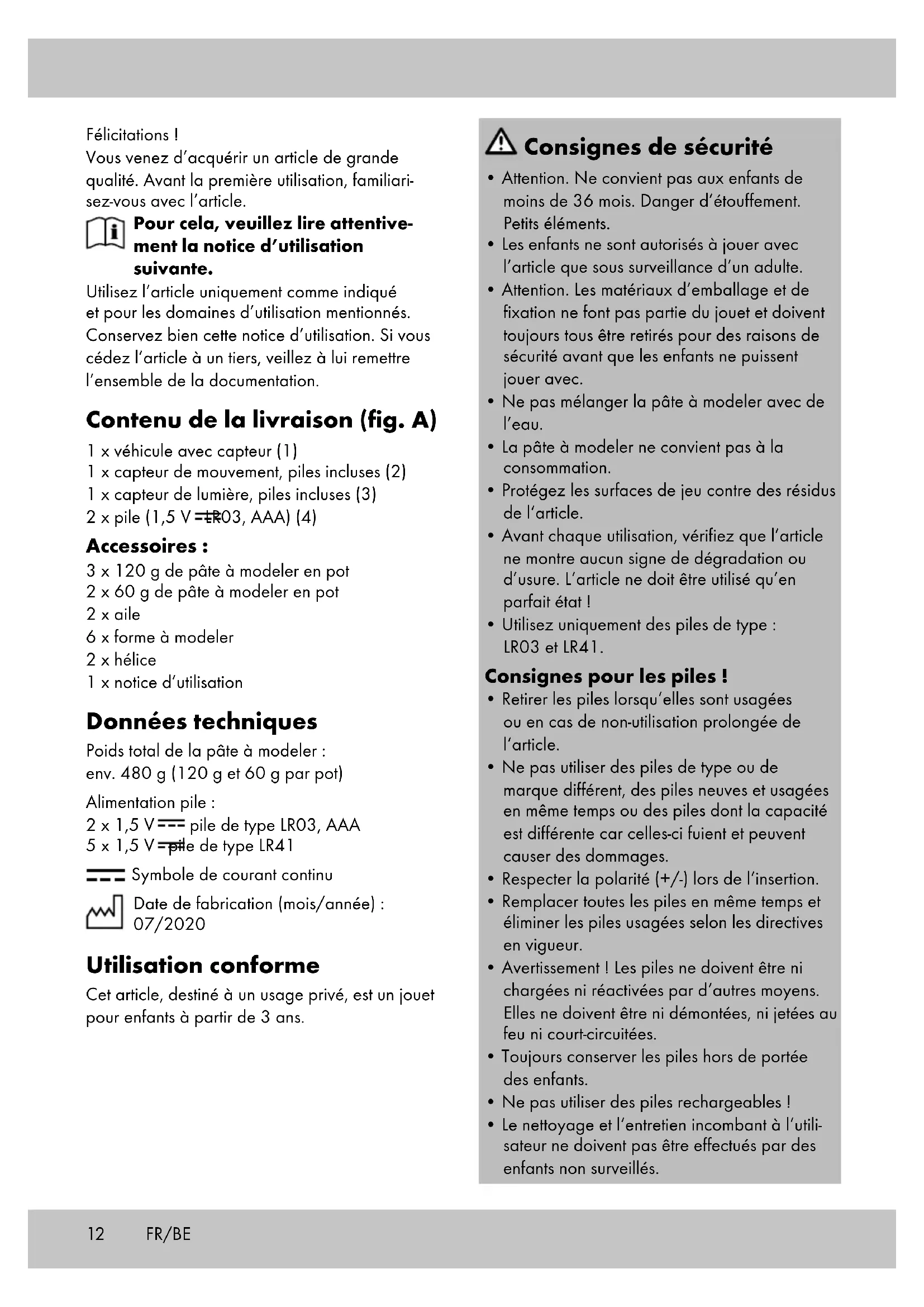 - s‘il présente les qualités qu‘un acheteur peut légitimement attendre eu égard aux déclara- tions publiques faites par le vendeur, par le producteur ou par son représentant, notam- ment dans la publicité ou l‘étiquetage ; 2° Ou s‘il présente les caractéristiques définies d‘un commun accord par les parties ou être propre à tout usage spécial recherché par l‘acheteur, porté à la connaissance du vendeur et que ce dernier a accepté. Article L217-12 du Code de la consommation L‘action résultant du défaut de conformité se prescrit par deux ans à compter de la délivrance du bien. Article 1641 du Code civil Le vendeur est tenu de la garantie à raison des défauts cachés de la chose vendue qui la rendent impropre à l‘usage auquel on la destine, ou qui diminuent tellement cet usage que l‘acheteur ne l‘aurait pas acquise, ou n‘en aurait donné qu‘un moindre prix, s‘il les avait connus. Article 1648 1er alinéa du Code civil L‘action résultant des vices rédhibitoires doit être intentée par l‘acquéreur dans un délai de deux ans à compter de la découverte du vice. Les pièces détachées indispensables à l’utili- sation du produit sont disponibles pendant la durée de la garantie du produit. IAN : 346971_2001 Service France Tel. : 0800 919270 E-Mail : deltasport@lidl.fr Service Belgique Tel. : 070 270 171 (0,15 EUR/Min.) E-Mail : deltasport@lidl.be FR/BE16 Gefeliciteerd! Met uw aankoop hebt u voor een hoogwaardig artikel gekozen. Zorg ervoor dat u voor het eerste gebruik met het artikel vertrouwd raakt. Lees hiervoor de volgende gebruiksaanwijzing zorgvuldig door. Gebruik het artikel alleen zoals omschreven en voor het aangegeven doel. Bewaar deze ge- bruiksaanwijzing goed. Geef alle documenten mee als u het artikel aan iemand anders geeft. In het leveringspakket inbegrepen (afb. A) 1 x chassis met sensor (1) 1 x bewegingssensor, incl. batterijen (2) 1 x lichtsensor, incl. batterijen (3) 2 x batterij (1,5V LR03, AAA) (4) Accessoires: 3 x kneedsel in blik à 120 g 2 x kneedsel in blik à 60 g 2 x vleugel 6 x bouwvormpje 2 x propeller 1 x gebruiksaanwijzing Technische gegevens Totaalgewicht kneedsel: ca. 480 g (telkens 120 g en 60 g per blik) Energievoorziening batterij: 2 x 1,5V Batterijtype LR03, AAA 5 x 1,5V Batterijtype LR41 Symbool voor gelijkspanning Productiedatum (maand/jaar): 07/2020 Voorgeschreven gebruik Bij dit artikel gaat het om speelgoed voor kinderen met een leeftijd vanaf 3 jaar voor privégebruik. Veiligheidsinstructies