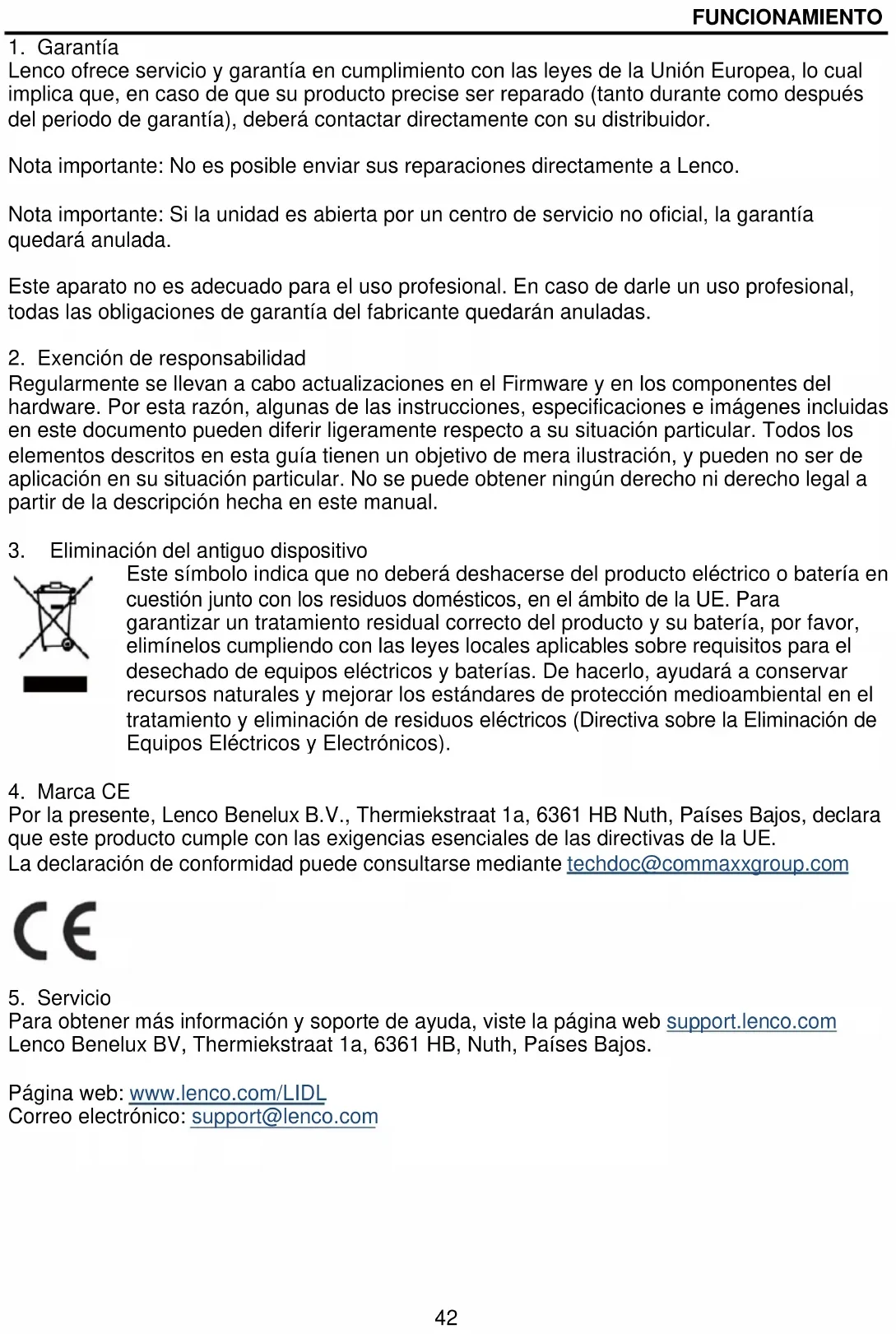 Par la présente, Lenco Benelux B.V., Thermiekstraat 1a, 6361 HB Nuth, Pays-Bas, déclare que ce produit est conforme aux exigences principales des directives européennes. La déclaration de conformité peut être consultée via techdoc@commaxxgroup.com