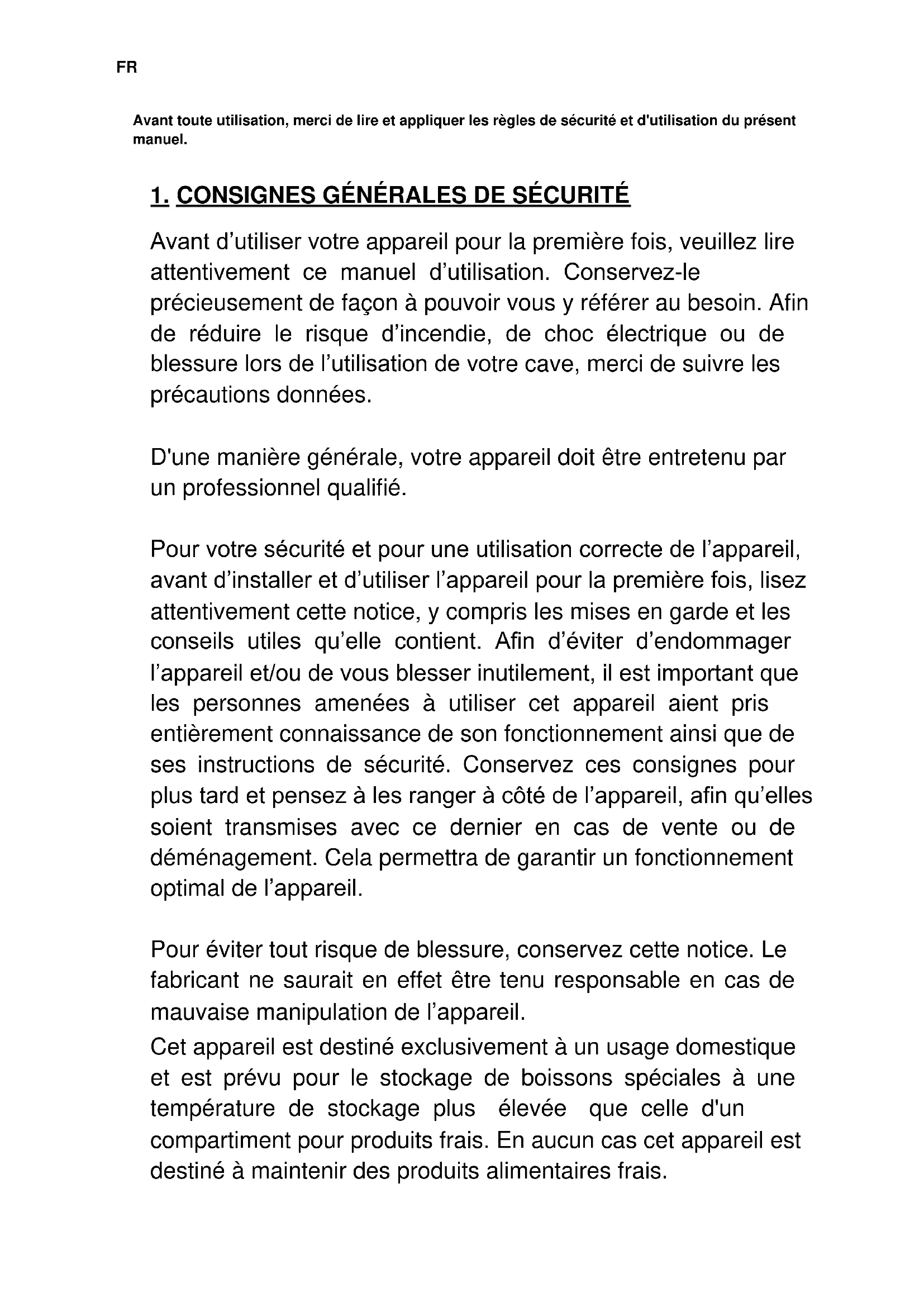 CONSIGNES GÉNÉRALES DE SÉCURITÉ Avant d’utiliser votre appareil pour la première fois, veuillez lire attentivement ce manuel d’utilisation. Conservez-le précieusement de façon à pouvoir vous y référer au besoin. Afin de réduire le risque d’incendie, de choc électrique ou de blessure lors de l’utilisation de votre cave, merci de suivre les précautions données. D'une manière générale, votre appareil doit être entretenu par un professionnel qualifié. Pour votre sécurité et pour une utilisation correcte de l’appareil, avant d’installer et d’utiliser l’appareil pour la première fois, lisez attentivement cette notice, y compris les mises en garde et les conseils utiles qu’elle contient. Afin d’éviter d’endommager l’appareil et/ou de vous blesser inutilement, il est important que les personnes amenées à utiliser cet appareil aient pris entièrement connaissance de son fonctionnement ainsi que de ses instructions de sécurité. Conservez ces consignes pour plus tard et pensez à les ranger à côté de l’appareil, afin qu’elles soient transmises avec ce dernier en cas de vente ou de déménagement. Cela permettra de garantir un fonctionnement optimal de l’appareil. Pour éviter tout risque de blessure, conservez cette notice. Le fabricant ne saurait en effet être tenu responsable en cas de mauvaise manipulation de l’appareil. Cet appareil est destiné exclusivement à un usage domestique et est prévu pour le stockage de boissons spéciales à une température de stockage plus élevée que celle d'un compartiment pour produits frais. En aucun cas cet appareil est destiné à maintenir des produits alimentaires frais.FR