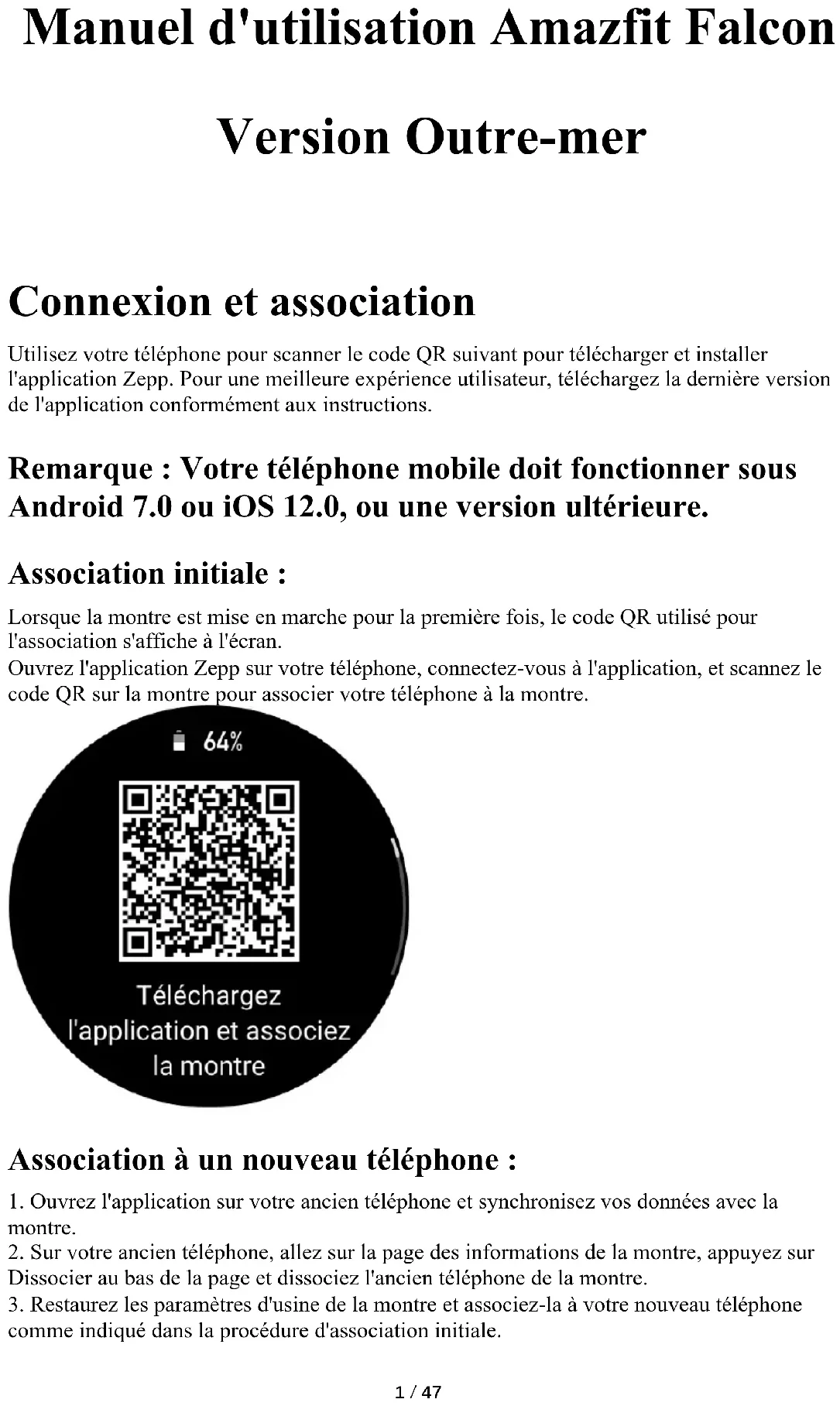 1 / 47 Manuel d'utilisation Amazfit Falcon Version Outre-mer Connexion et association Utilisez votre téléphone pour scanner le code QR suivant pour télécharger et installer l'application Zepp. Pour une meilleure expérience utilisateur, téléchargez la dernière version de l'application conformément aux instructions. Remarque : Votre téléphone mobile doit fonctionner sous Android 7.0 ou iOS 12.0, ou une version ultérieure. Association initiale : Lorsque la montre est mise en marche pour la première fois, le code QR utilisé pour l'association s'affiche à l'écran. Ouvrez l'application Zepp sur votre téléphone, connectez-vous à l'application, et scannez le code QR sur la montre pour associer votre téléphone à la montre. Association à un nouveau téléphone :