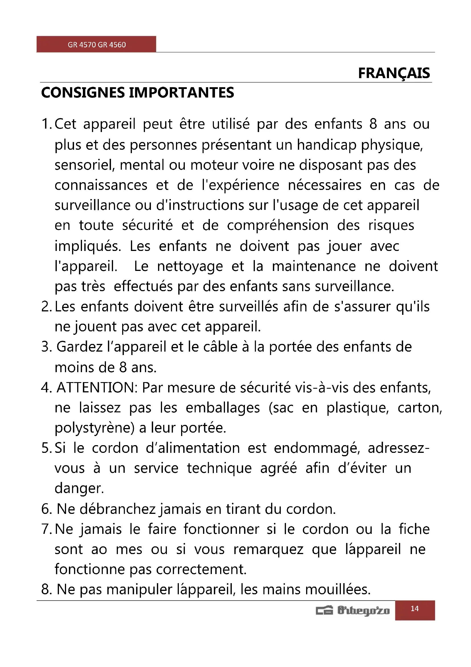 8. Ne pas manipuler l´appareil, les mains mouillées.GR 4570 GR 4560