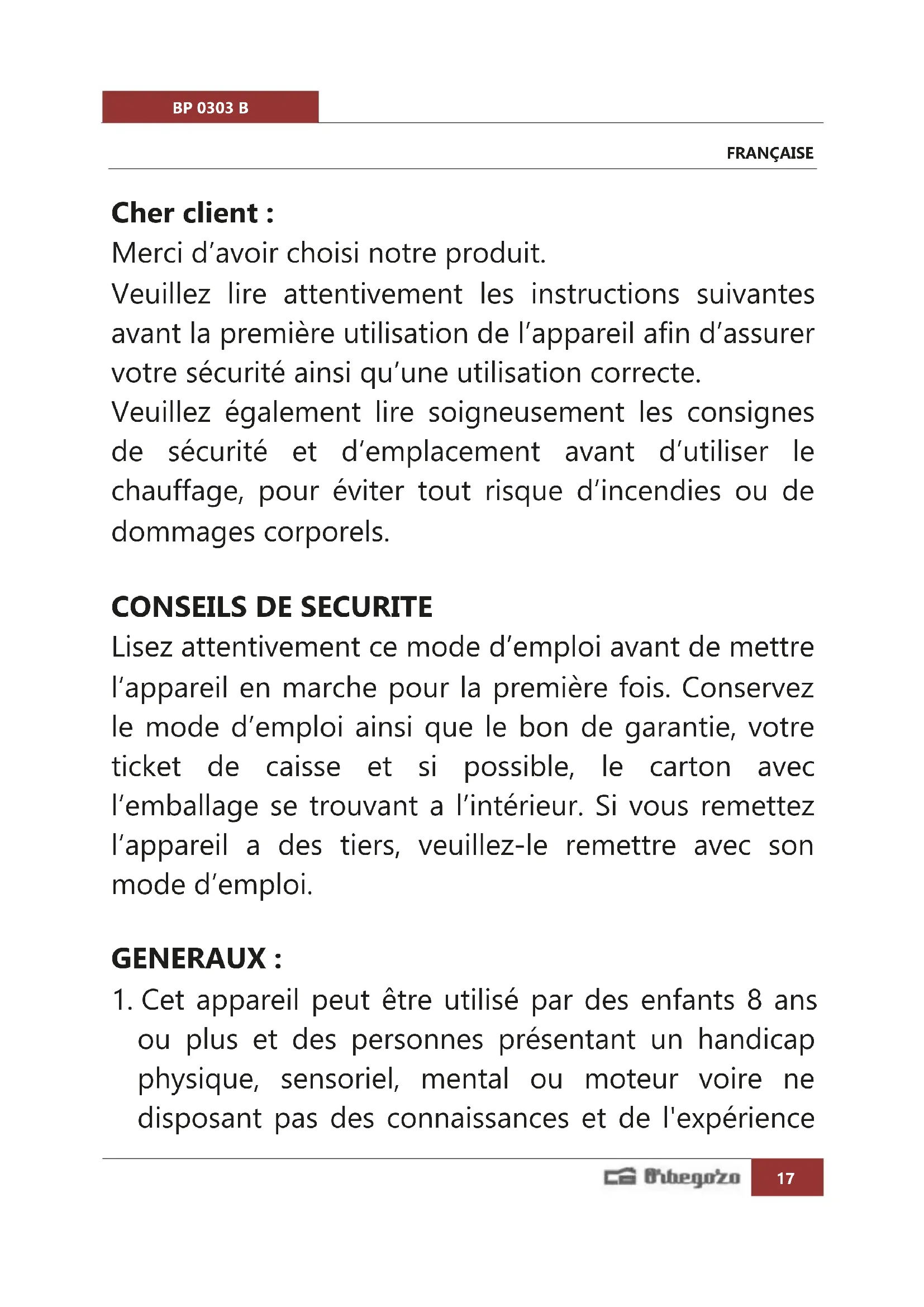BP 0303 B - Chauffage Orbegozo - Notice d'utilisation et mode d'emploi gratuit