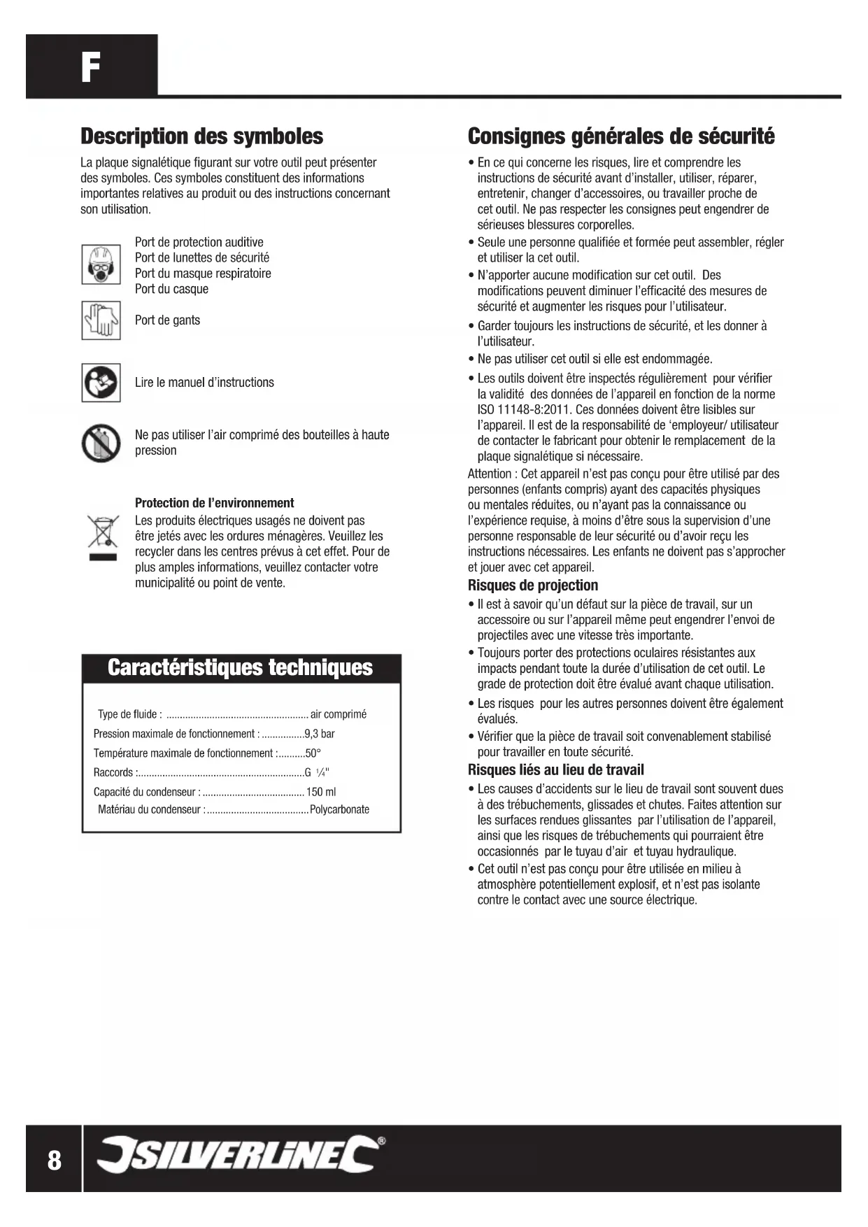 Lire le manuel d’instructions Ne pas utiliser l’air comprimé des bouteilles à haute pression Protection de l’environnement Les produits électriques usagés ne doivent pas être jetés avec les ordures ménagères. Veuillez les recycler dans les centres prévus à cet effet. Pour de plus amples informations, veuillez contacter votre municipalité ou point de vente. Caractéristiques techniques Type de fluide : ..................................................... air comprimé Pression maximale de fonctionnement : ................9,3 bar Température maximale de fonctionnement : ..........50° Raccords :..............................................................G ⁄4" Capacité du condenseur : ...................................... 150 ml Matériau du condenseur : ...................................... Polycarbonate 427596_Z1MANPRO2.indd 8 07/01/2014 16:10www.silverlinetools.com
