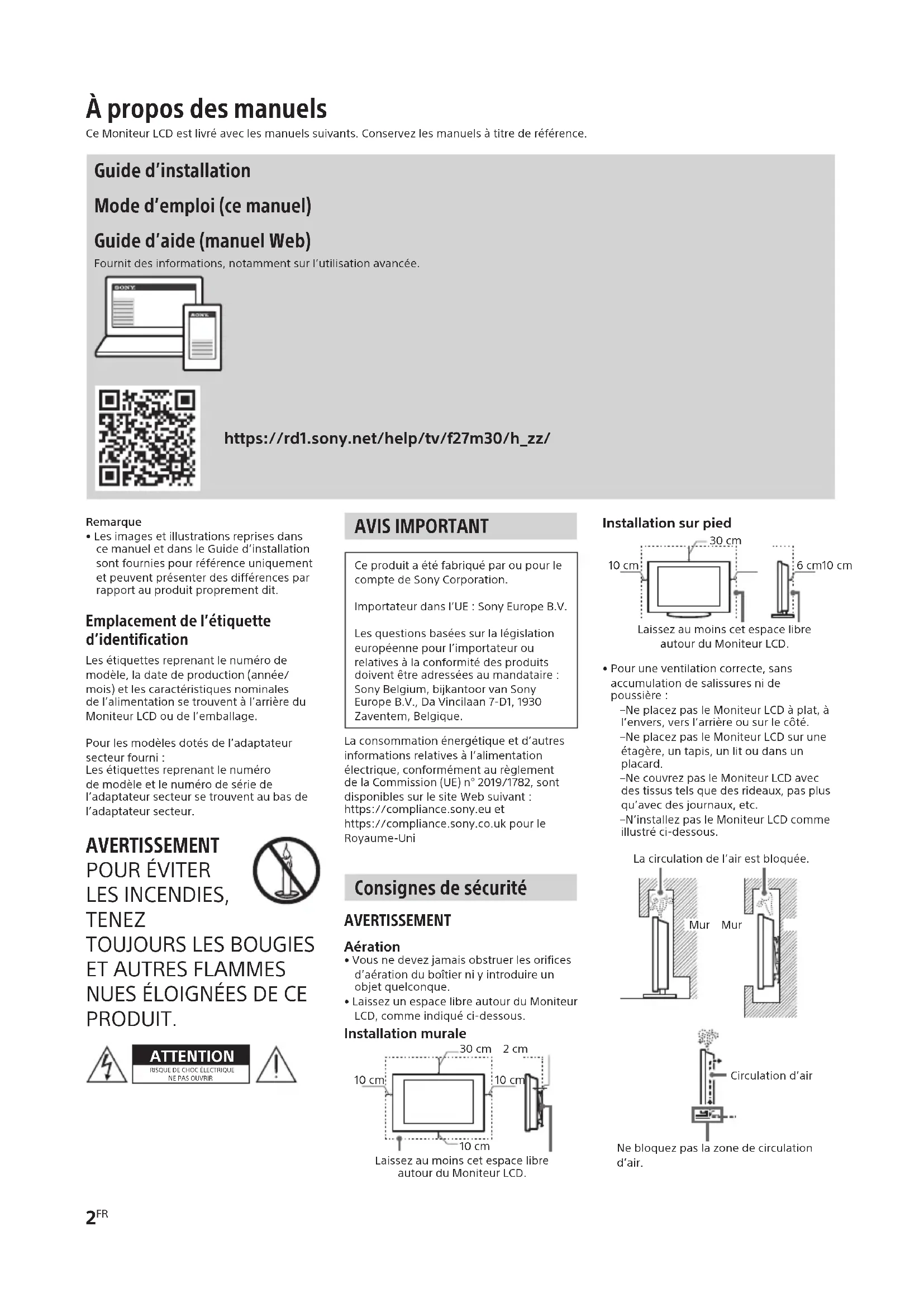 PRODUIT. ATTENTIONRISQUEDECHOCÉLECTRIQUENEPASOUVRIR AVIS IMPORTANT CeproduitaétéfabriquéparoupourlecomptedeSonyCorporation.Importateurdansl’UE:SonyEuropeB.V.Lesquestionsbaséessurlalégislationeuropéennepourl’importateurourelativesàlaconformitédesproduitsdoiventêtreadresséesaumandataire:SonyBelgium,bijkantoorvanSonyEuropeB.V.,DaVincilaan7-D1,1930Zaventem,Belgique.Laconsommationénergétiqueetd’autresinformationsrelativesàl’alimentationélectrique,conformémentaurèglementdelaCommission(UE)n°2019/1782,sontdisponiblessurlesiteWebsuivant:https://compliance.sony.euethttps://compliance.sony.co.ukpourleRoyaume-Uni Consignes de sécurité AVERTISSEMENT Aération•Vousnedevezjamaisobstruerlesorificesd’aérationduboîtierniyintroduireunobjetquelconque.•LaissezunespacelibreautourduMoniteurLCD,commeindiquéci-dessous.Installation muraleLaissezaumoinscetespacelibreautourduMoniteurLCD.10cm30cm 2cm10cm10cmInstallation sur piedLaissezaumoinscetespacelibreautourduMoniteurLCD.6cm10cm30cm10cm•Pouruneventilationcorrecte,sansaccumulationdesalissuresnidepoussière:– NeplacezpasleMoniteurLCDàplat,àl’envers,versl’arrièreousurlecôté.– NeplacezpasleMoniteurLCDsuruneétagère,untapis,unlitoudansunplacard.– NecouvrezpasleMoniteurLCDavecdestissustelsquedesrideaux,pasplusqu’avecdesjournaux,etc.– N’installezpasleMoniteurLCDcommeillustréci-dessous.Lacirculationdel’airestbloquée.Mur MurCirculationd’airNebloquezpaslazonedecirculationd’air. À propos des manuels CeMoniteurLCDestlivréaveclesmanuelssuivants.Conservezlesmanuelsàtitrederéférence. Guide d’installation Mode d’emploi (ce manuel) Guide d’aide (manuel Web) Fournitdesinformations,notammentsurl’utilisationavancée.https://rd1.sony.net/help/tv/f27m30/h_zz/SDM-F27M30 5-047-045-31(1)