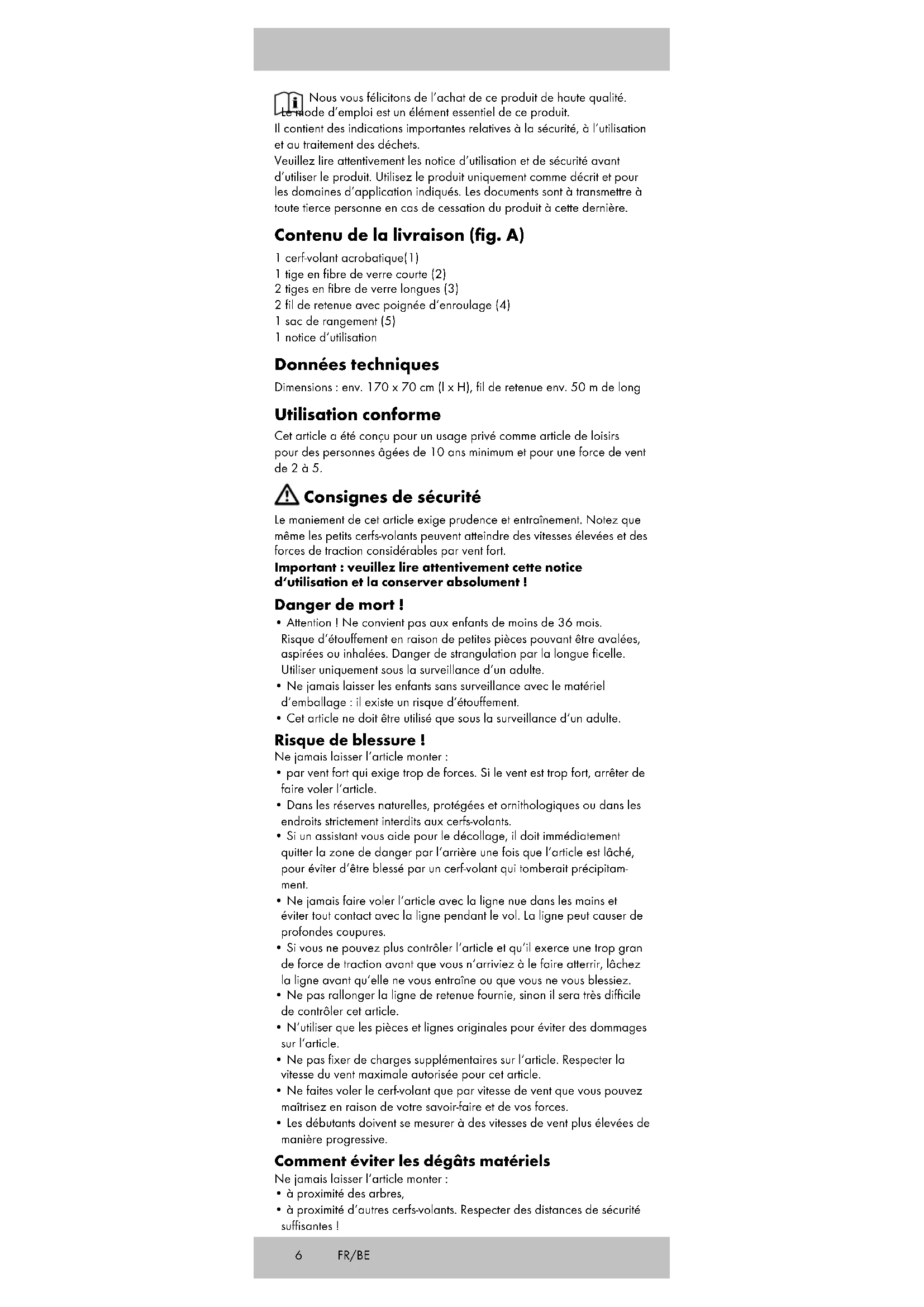 - à proximité d‘autres cerfs-volants. Respecter des distances de sécurité suffisantes ! FR/BE7 Avertissement ! Danger de mort ! Ne jamais laisser l‘article monter :
