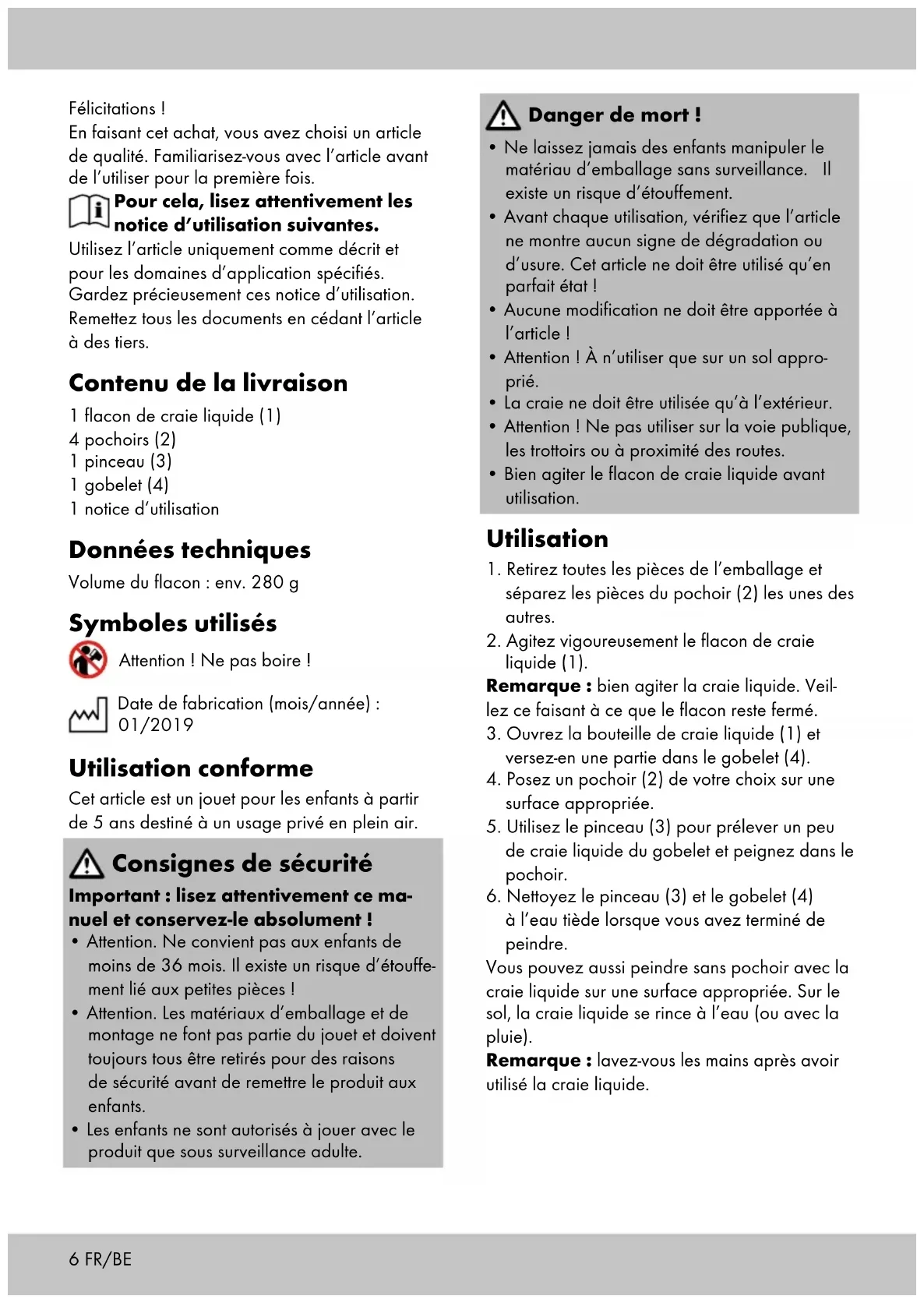 - s‘il présente les qualités qu‘un acheteur peut légitimement attendre eu égard aux déclara- tions publiques faites par le vendeur, par le producteur ou par son représentant, notam- ment dans la publicité ou l‘étiquetage ; 2° Ou s‘il présente les caractéristiques définies d‘un commun accord par les parties ou être propre à tout usage spécial recherché par l‘acheteur, porté à la connaissance du vendeur et que ce dernier a accepté. Article L217-12 du Code de la consommation L‘action résultant du défaut de conformité se prescrit par deux ans à compter de la délivrance du bien. Article 1641 du Code civil Le vendeur est tenu de la garantie à raison des défauts cachés de la chose vendue qui la ren- dent impropre à l‘usage auquel on la destine, ou qui diminuent tellement cet usage que l‘acheteur ne l‘aurait pas acquise, ou n‘en aurait donné qu‘un moindre prix, s‘il les avait connus. Article 1648 1er alinéa du Code civil L‘action résultant des vices rédhibitoires doit être intentée par l‘acquéreur dans un délai de deux ans à compter de la découverte du vice. Les pièces détachées indispensables à l’utilisation du produit sont disponibles pendant la durée de la garantie du produit. IAN : 313524 Service France Tel. : 0800 919270 E-Mail : deltasport@lidl.fr Service Belgique Tel. : 070 270 171 (0,15 EUR/Min.) E-Mail : deltasport@lidl.be9 Hartelijk gefeliciteerd! Met uw aankoop hebt u voor een hoogwaardig artikel geopteerd. Maak u vertrouwd met het artikel voordat u het voor het eerst gebruikt. Lees hiervoor aandachtig de hiernavolgende gebruiksaanwij- zing. Gebruik het artikel alleen zoals beschre- ven en voor de aangegeven toepassingsgebie- den. Berg deze gebruiksaanwijzing goed op. Overhandig eveneens alle documenten wanneer u het artikel aan derden doorgeeft. In het leveringspakket inbe- grepen 1 x flacon met vloeibaar krijt (1) 4 x sjabloon (2) 1 x penseel (3) 1 x beker (4) 1 x gebruiksaanwijzing Technische gegevens Inhoud van de flacon: ca. 280 g Gebruikte symbolen Waarschuwing! Niet drinken! Productiedatum (maand/jaar): 01/2019 Voorgeschreven gebruik Bij dit artikel gaat het om speelgoed voor kinderen met een leeftijd vanaf 5 jaar dat voor privégebruik in de open lucht ontwikkeld werd. Veiligheidsinstructies Belangrijk: Lees deze gebruiksaanwij- zing zorgvuldig en bewaar ze in ieder geval!