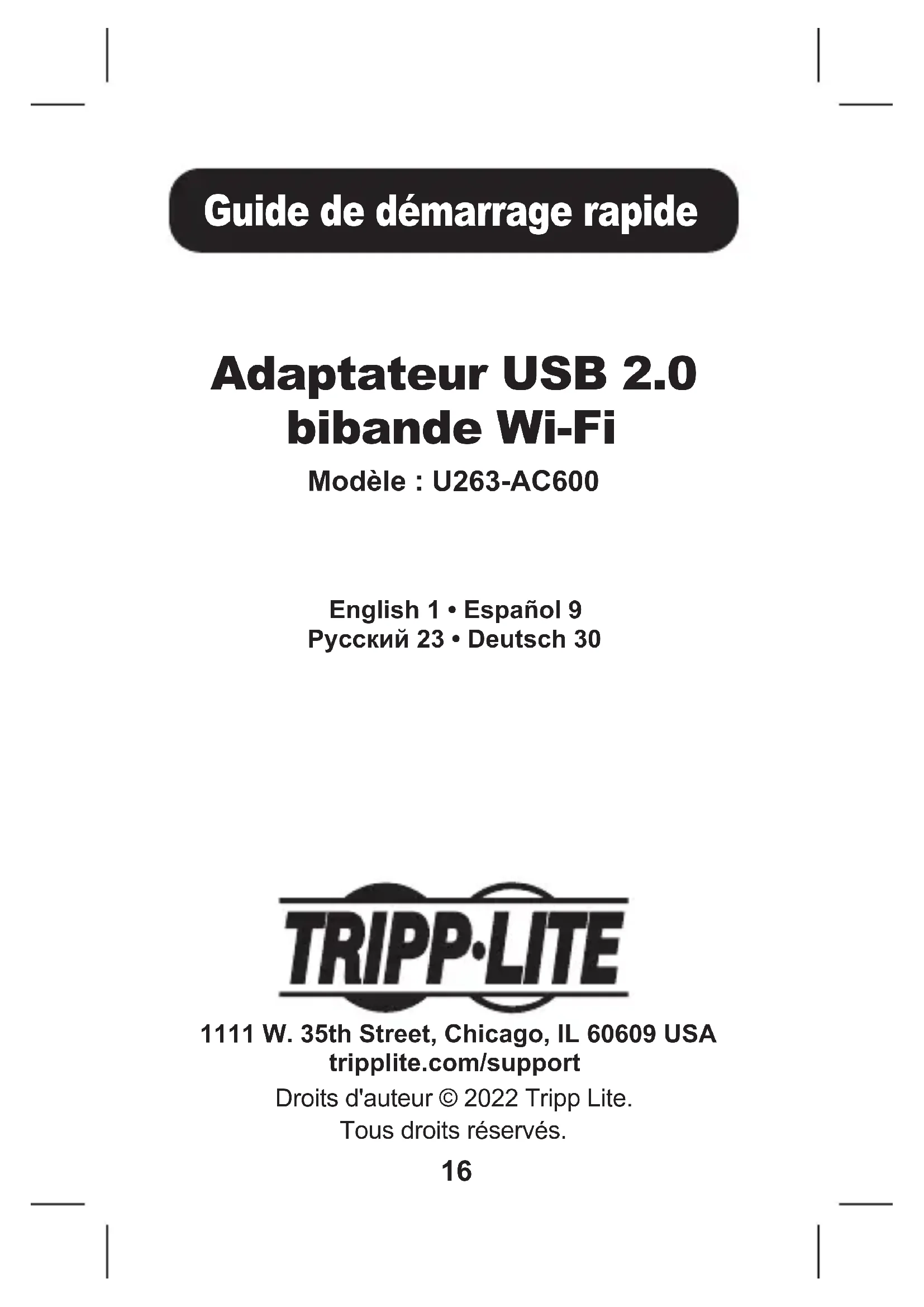 de déterminer avant l'utilisation si cet appareil est approprié, adéquat et sûr pour l'usage prévu. Puisque les utilisations individuelles sont sujettes à des variations importantes, le fabricant ne fait aucune déclaration ou garantie quant à l'aptitude ou l'adaptation de ces dispositifs pour une application spécique.22 Garantie Tout changement ou modication apportés à ce matériel sans l'autorisation expresse de Tripp Lite peuvent annuler le droit de l'utilisateur d'utiliser cet équipement. Il n'est pas recommandé d'utiliser cet équipement pour des appareils de survie où une défaillance de cet équipement peut, selon toute vraisemblance, entraîner la défaillance de l’appareil de maintien de la vie ou aecter de façon majeure sa sécurité ou son ecacité. La politique de Tripp Lite en est une d'amélioration continue. Les caractéristiques techniques sont modiables sans préavis. Les produits réels peuvent diérer légèrement des photos et des illustrations. 1111 W. 35th Street, Chicago, IL 60609 USA tripplite.com/support 22-01-388 93-3D2C_RevB23 Краткое руководство пользователя Двухдиапазонный Wi-Fi адаптер с интерфейсом USB 2.0 Модель: U263-AC600 1111 W. 35th Street, Chicago, IL 60609 USA tripplite.com/support Охраняется авторским правом © 2022 Tripp Lite. Перепечатка запрещается. English 1 • Español 9 Français 16 • Deutsch 3024 Характеристики изделия