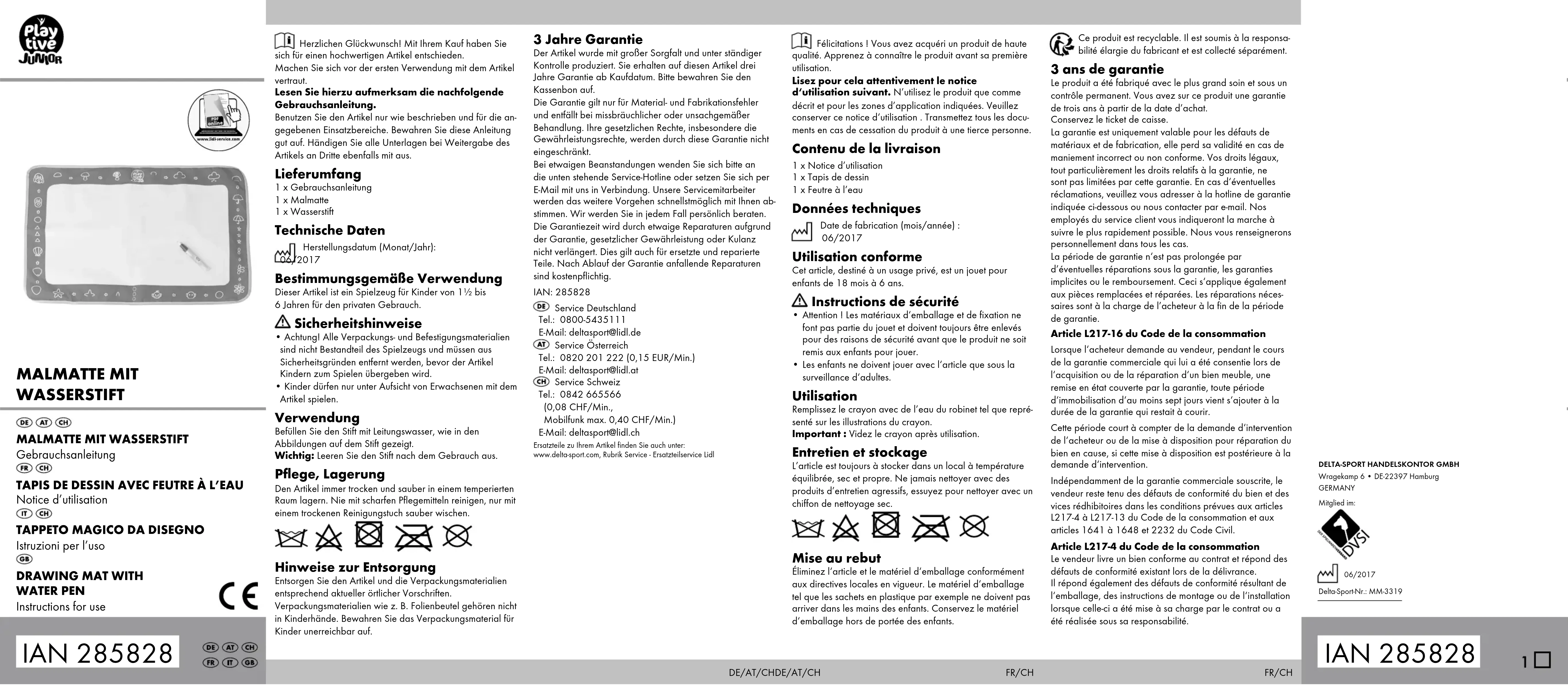 - s‘il présente les qualités qu‘un acheteur peut légitimement attendre eu égard aux déclara- tions publiques faites par le vendeur, par le producteur ou par son représentant, notam- ment dans la publicité ou l‘étiquetage ; 2° Ou s‘il présente les caractéristiques définies d‘un commun accord par les parties ou être propre à tout usage spécial recherché par l‘acheteur, porté à la connaissance du vendeur et que ce dernier a accepté. Article L217-12 du Code de la consommation L‘action résultant du défaut de conformité se prescrit par deux ans à compter de la délivrance du bien. Article 1641 du Code civil Le vendeur est tenu de la garantie à raison des défauts ca- chés de la chose vendue qui la rendent impropre à l‘usage auquel on la destine, ou qui diminuent tellement cet usage que l‘acheteur ne l‘aurait pas acquise, ou n‘en aurait donné qu‘un moindre prix, s‘il les avait connus. Article 1648 1er alinéa du Code civil L‘action résultant des vices rédhibitoires doit être intentée par l‘acquéreur dans un délai de deux ans à compter de la découverte du vice. Les pièces détachées indispensables à l’utilisation du produit sont disponibles pendant la durée de la garantie du produit. IAN : 285828 Service Suisse Tel. : 0842 665566 (0,08 CHF/Min., mobile max. 0,40 CHF/Min.) E-Mail : deltasport@lidl.ch Veuillez trouver les pièces de rechange pour votre produit sur : www.delta-sport.com, rubrique Service - Service des pièces de rechange Lidl FR/CH Congratulazioni! Con il vostro acquisto avete scelto un prodotto altamente qualitativo. Familiarizzate con il prodot- to prima di prenderlo in funzione. Leggete attentamente le seguenti istruzioni per l’uso. Utilizzate il prodotto soltanto per lo scopo previsto e i campi d´impiego indicati. Conservate bene queste istruzioni. In caso di inoltro del prodotto a terzi, pregasi consegnare tutta la documentazione. Contenuto della confezione 1 x Istruzioni per l’uso 1 x Tappeto magico 1 x Acqua penna Dati tecnici Data di produzione (anno/mese): 06/2017 Utilizzo conforme Questo articolo è un giocattolo per bambini da 1 1/2 a 6 anni di età, per l’utilizzo privato. Avvertenze di sicurezza