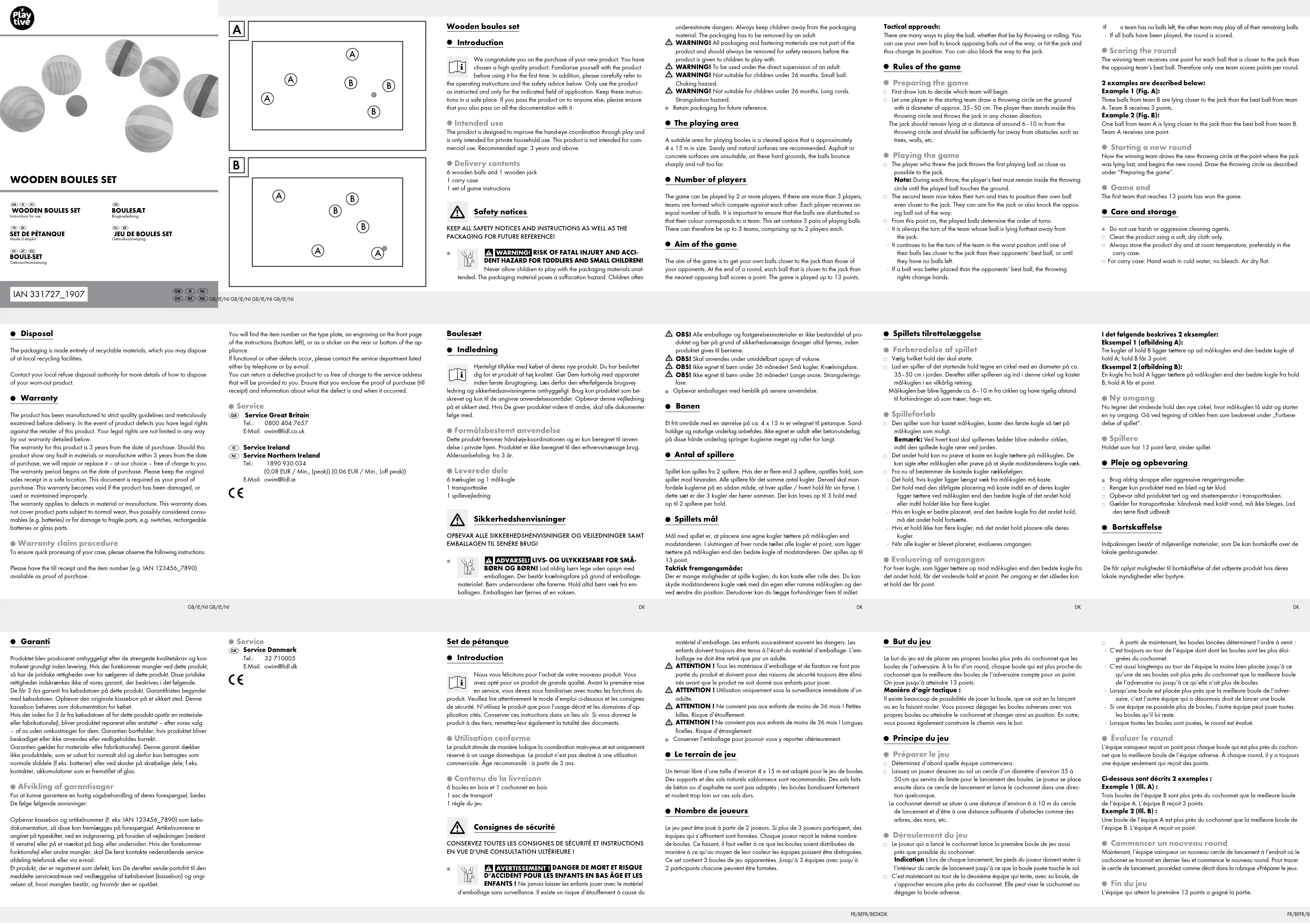 GB/IE/NI GB/IE/NI GB/IE/NI GB/IE/NI GB/IE/NIGB/IE/NI GB/IE/NIFR/BEFR/BE À partir de maintenant, les boules lancées déterminent l‘ordre à venir : · C‘est toujours au tour de l‘équipe dont dont les boules sont les plus éloi-gnées du cochonnet. · C‘est aussi longtemps au tour de l‘équipe la moins bien placée jusqu‘à ce qu‘une de ses boules soit plus près du cochonnet que la meilleure boule de l‘adversaire ou jusqu‘à ce qu‘elle n‘ait plus de boules. · Lorsqu‘une boule est placée plus près que la meilleure boule de l‘adver-saire, c‘est l‘autre équipe qui a désormais droit de lancer une boule. · Si une équipe ne possède plus de boules, l‘autre équipe peut jouer toutes les boules qu‘il lui reste. · Lorsque toutes les boules sont jouées, le round est évalué. Évaluer le round L‘équipe vainqueur reçoit un point pour chaque boule qui est plus près du coc hon- net que la meilleure boule de l‘équipe adverse. À chaque round, il y a toujours une équipe seulement qui reçoit des points.Ci-dessous sont décrits 2 exemples :Exemple 1 (Ill. A) : Trois boules de l‘équipe B sont plus près du cochonnet que la meilleure boule de l‘équipe A. L‘équipe B reçoit 3 points.Exemple 2 (Ill. B) : Une boule de l‘équipe A est plus près du cochonnet que la meilleure boule de l‘équipe B. L‘équipe A reçoit un point. Commencer un nouveau round Maintenant, l‘équipe vainqueur un nouveau cercle de lancement à l‘endroit où le cochonnet se trouvait en dernier lieu et commence le nouveau round. Pour tracer le cercle de lancement, procédez comme décrit dans la rubrique «Préparer le jeu». Fin du jeu L‘équipe qui atteint la première 13 points a gagné la partie. DKDK I det følgende beskrives 2 eksempler:Eksempel 1 (afbildning A):Tre kugler af hold B ligger tættere op ad mål-kuglen end den bedste kugle af hold A; hold B får 3 point.Eksempel 2 (afbildning B):En kugle fra hold A ligger tættere på mål-kuglen end den bedste kugle fra hold B; hold A får et point. Ny omgangNu tegner det vindende hold den nye cirkel, hvor mål-kuglen lå sidst og starter en ny omgang. Gå ved tegning af cirklen frem som beskrevet under „Forbere-delse af spillet“. SpillereHoldet som har 13 point først, vinder spillet. Pleje og opbevaring Brug aldrig skrappe eller aggressive rengøringsmidler. Rengør kun produktet med en blød og tør klud. Opbevar altid produktet tørt og ved stuetemperatur i transporttasken. Gælder for transporttaske: håndvask med koldt vand, må ikke bleges. Lad den tørre fladt udbredt. Bortskaffelse Indpakningen består af miljøvenlige materialer, som De kan bortskaffe over de lokale genbrugssteder. De får oplyst muligheder til bortskaffelse af det udtjente produkt hos deres lokale myndigheder eller bystyre.
