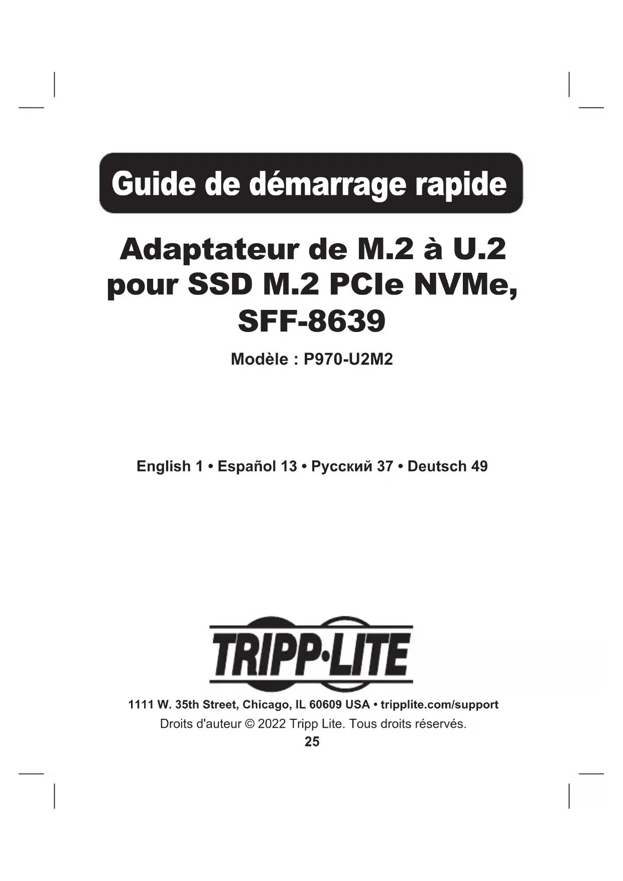 Tripp Lite garantit que ses produits sont exempts de vices de matériaux et de fabrication pendant une période d'un (1) an à partir de la date d'achat initiale. La responsabilité de Tripp Lite, en vertu de la présente garantie, se limite à la réparation ou au remplacement (à sa seule discrétion) de ces produits défectueux. Pour obtenir réparation sous cette garantie, vous devez obtenir un numéro d'autorisation de retour de matériel (« RMA ») auprès de Tripp Lite ou d'un centre de réparation autorisé par Tripp Lite. Les produits doivent être retournés à Tripp Lite ou à un centre de réparation autorisé par Tripp Lite en port prépayé et être accompagnés d'une brève description du problème et d'un justicatif de la date et du lieu d'achat. Cette garantie ne s'applique pas au matériel ayant été endommagé suite à un accident, à une négligence ou à une application abusive, ou ayant été altéré ou modié d'une façon quelconque. SAUF DANS LES CAS PRÉVUS PAR LES PRÉSENTES, TRIPP LITE N'ACCORDE AUCUNE GARANTIE, EXPRESSE OU TACITE, Y COMPRIS DES GARANTIES DE QUALITÉ COMMERCIALE ET D'ADAPTATION À UN USAGE PARTICULIER. Certains États n'autorisant pas la limitation ni l'exclusion de garanties tacites, les limitations ou exclusions susmentionnées peuvent ne pas s'appliquer à l'acheteur. À L'EXCEPTION DES DISPOSITIONS CI-DESSUS, TRIPP LITE NE POURRA EN AUCUN CAS ÊTRE TENUE RESPONSABLE DE DOMMAGES DIRECTS, INDIRECTS, SPÉCIAUX, FORTUITS OU CONSÉCUTIFS RÉSULTANT DE L'UTILISATION DE CE PRODUIT, MÊME SI AYANT ÉTÉ AVISÉE DE L'ÉVENTUALITÉ DE TELS DOMMAGES. Plus précisément, Tripp Lite ne pourra être tenue responsable de coûts, tels que perte de bénéces ou de recettes, perte de matériel, impossibilité d'utilisation du matériel, perte de logiciel, perte de données, frais de produits de remplacement, réclamations d'un tiers ou autres. Il n'est pas recommandé d'utiliser cet équipement pour des appareils de survie où une défaillance de cet équipement peut, selon toute vraisemblance, entraîner la défaillance de l’appareil de maintien de la vie ou nuire de façon majeure à sa sécurité ou à son ecacité. La politique de Tripp Lite en est une d'amélioration continue. Les caractéristiques techniques sont modiables sans préavis. Les produits réels peuvent diérer légèrement des photos et des illustrations.37 Адаптер M.2 - U.2 для SSD M.2 PCIe NVMe, SFF-8639 Модель: P970-U2M2 1111 W. 35th Street, Chicago, IL 60609 USA • tripplite.com/supportCopyright © 2022 Tripp Lite. Перепечатка запрещается. Краткое руководство пользователя English 1 • Español 13 • Français 25 • Deutsch 4938