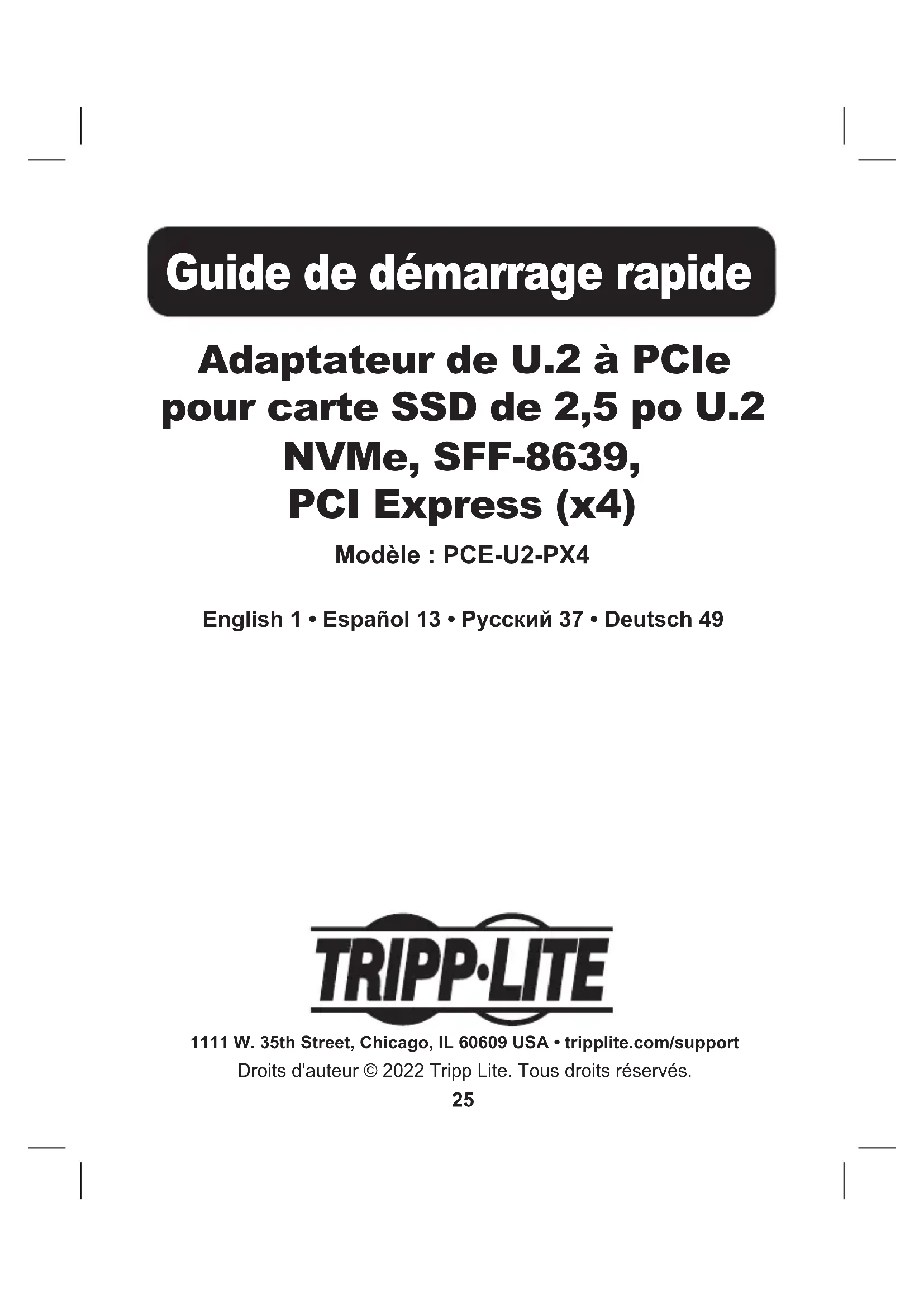 Tripp Lite garantit que ses produits sont exempts de vices de matériaux et de fabrication pendant une période d'un (1) an à partir de la date d'achat initiale. La responsabilité de Tripp Lite, en vertu de la présente garantie, se limite à la réparation ou au remplacement (à sa seule discrétion) de ces produits défectueux. Pour obtenir réparation sous cette garantie, vous devez obtenir un numéro d'autorisation de retour de matériel (« RMA ») auprès de Tripp Lite ou d'un centre de réparation autorisé par Tripp Lite. Les produits doivent être retournés à Tripp Lite ou à un centre de réparation autorisé par Tripp Lite en port prépayé et être accompagnés d'une brève description du problème et d'un justicatif de la date et du lieu d'achat. Cette garantie ne s'applique pas au matériel ayant été endommagé suite à un accident, à une négligence ou à une application abusive, ou ayant été altéré ou modié d'une façon quelconque. SAUF DANS LES CAS PRÉVUS PAR LES PRÉSENTES, TRIPP LITE N'ACCORDE AUCUNE GARANTIE, EXPRESSE OU TACITE, Y COMPRIS DES GARANTIES DE QUALITÉ COMMERCIALE ET D'ADAPTATION À UN USAGE PARTICULIER. Certains États n'autorisant pas la limitation ni l'exclusion de garanties tacites, les limitations ou exclusions susmentionnées peuvent ne pas s'appliquer à l'acheteur. À L'EXCEPTION DES DISPOSITIONS CI-DESSUS, TRIPP LITE NE POURRA EN AUCUN CAS ÊTRE TENUE RESPONSABLE DE DOMMAGES DIRECTS, INDIRECTS, SPÉCIAUX, FORTUITS OU CONSÉCUTIFS RÉSULTANT DE L'UTILISATION DE CE PRODUIT, MÊME SI AYANT ÉTÉ AVISÉE DE L'ÉVENTUALITÉ DE TELS DOMMAGES. Plus précisément, Tripp Lite ne pourra être tenue responsable de coûts, tels que perte de bénéces ou de recettes, perte de matériel, impossibilité d'utilisation du matériel, perte de logiciel, perte de données, frais de produits de remplacement, réclamations d'un tiers ou autres. Il n'est pas recommandé d'utiliser cet équipement pour des appareils de survie où une défaillance de cet équipement peut, selon toute vraisemblance, entraîner la défaillance de l’appareil de maintien de la vie ou nuire de façon majeure à sa sécurité ou à son ecacité. La politique de Tripp Lite en est une d'amélioration continue. Les caractéristiques techniques sont modiables sans préavis. Les produits réels peuvent diérer légèrement des photos et des illustrations.36 1111 W. 35th Street, Chicago, IL 60609 USA • tripplite.com/support 22-06-195 934132_RevA37 Адаптер U.2 - PCIe для 2,5" U.2 NVMe SSD, SFF-8639, Карта PCI Express (4 шт.) Модель: PCE-U2-PX4 1111 W. 35th Street, Chicago, IL 60609 USA • tripplite.com/supportCopyright © 2022 Tripp Lite. Перепечатка запрещается. Краткое руководство пользователя English • Español 13 • Français 25 • Deutsch 4938