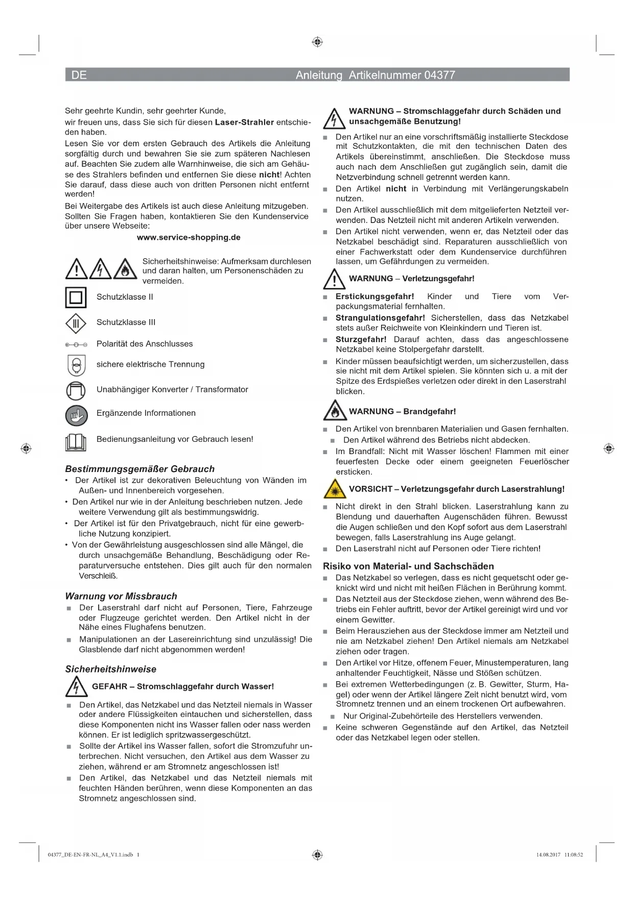 LaserstrahlungNicht direkt in den Strahl blicken Laser Klasse 2Wellenlänge(n) ȜQPJUQȜQPURW%HVWUDKOXQJVVWlUNHP:PðIEC EN 60825-1:2014 Z 04377 M DS V1.1 0817 04377_DE-EN-FR-NL_A4_V1.1.indb 404377_DE-EN-FR-NL_A4_V1.1.indb 4 14.08.2017 11:08:5914.08.2017 11:08:59FR Mode d'emploi Référence article 04377 Chère cliente, cher client, Nous vous félicitons d'avoir fait l'acquisition de ce projecteur laser. Veuillez lire attentivement le présent mode d’emploi avant la pre- mière utilisation de cet article et le conserver précieusement pour toute consultation ultérieure. Veuillez également observer toutes les mises en garde se trouvant sur le boîtier du projecteur et ne pas les ôter ! Veillez à ce qu'elles ne soient pas non plus enlevées par des tierces personnes ! Si vous donnez ou prêtez cet article à une tierce personne, n'oubliez pas d'y joindre ce mode d'emploi. Pour toute question, contactez le service après-vente à partir de notre site Internet : www.service-shopping.de Consignes de sécurité : lisez et observez-les attentivement afi n de prévenir tout risque de blessure. Classe de protection II Classe de protection III Polarité du branchement Isolation électrique sûre Convertisseur/transformateur indépendant Informations complémentaires Veuillez lire le présent mode d'emploi avant l'utilisation ! Utilisation conforme