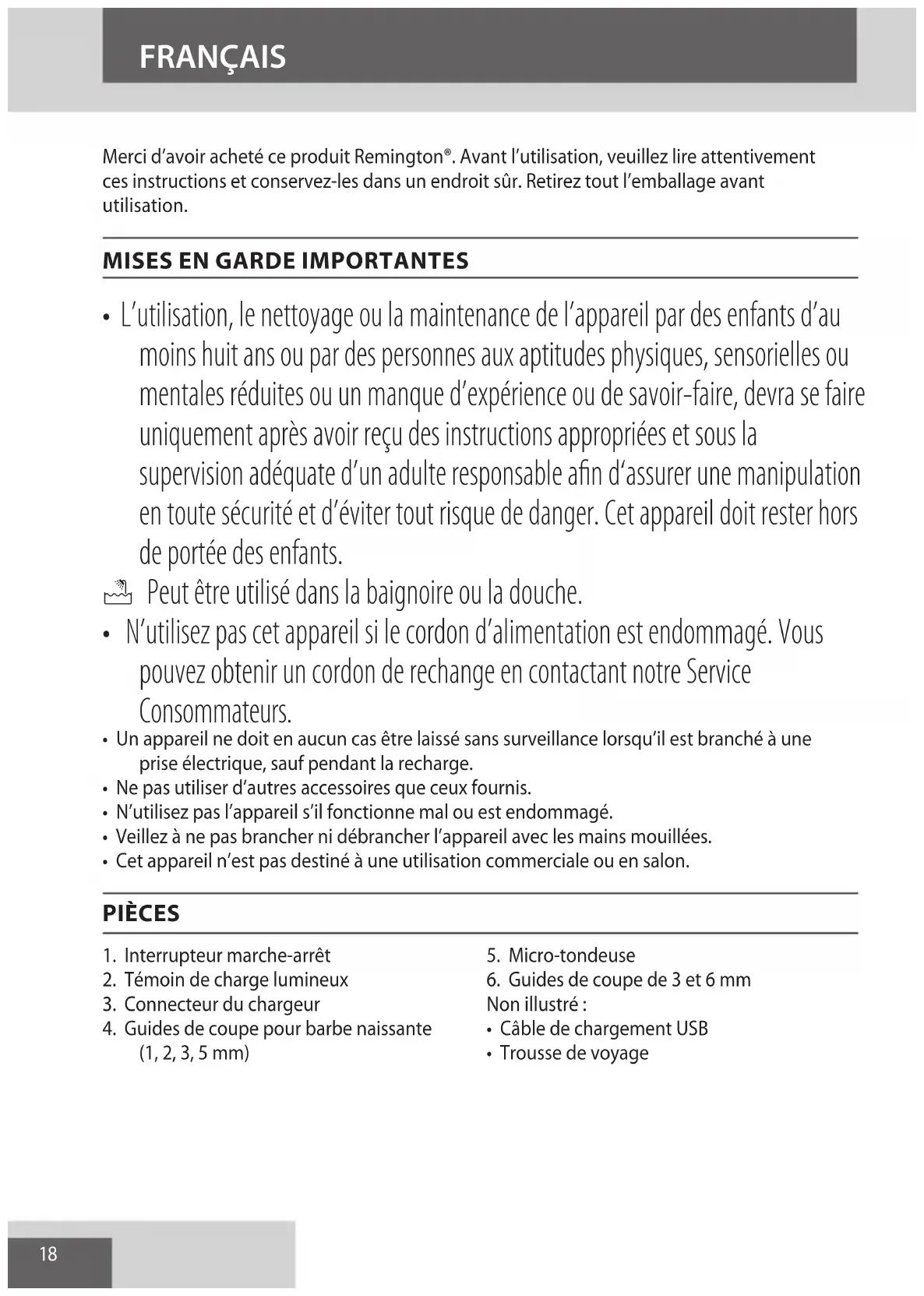 AE18 Merci d’avoir acheté ce produit Remington®. Avant l’utilisation, veuillez lire attentivement ces instructions et conservez-les dans un endroit sûr. Retirez tout l’emballage avant utilisation.
