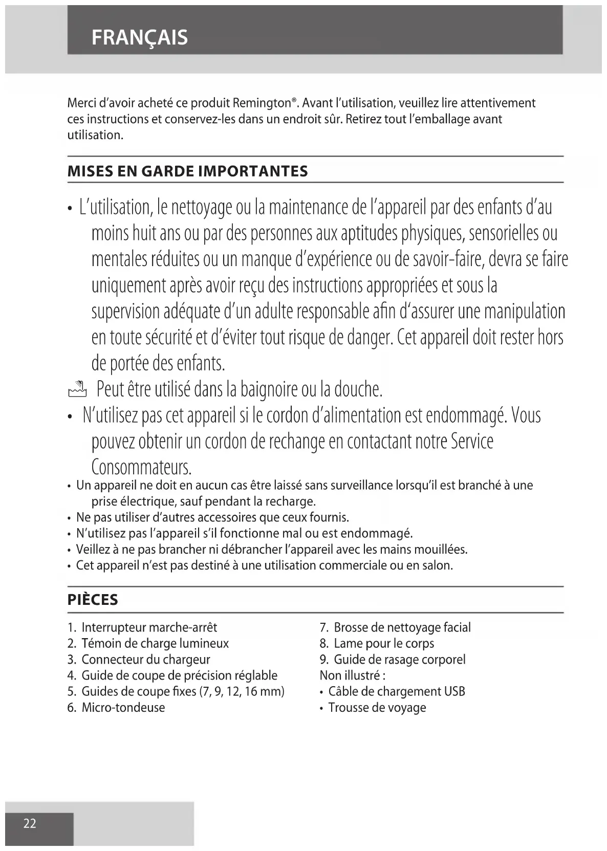AE22 Merci d’avoir acheté ce produit Remington®. Avant l’utilisation, veuillez lire attentivement ces instructions et conservez-les dans un endroit sûr. Retirez tout l’emballage avant utilisation.