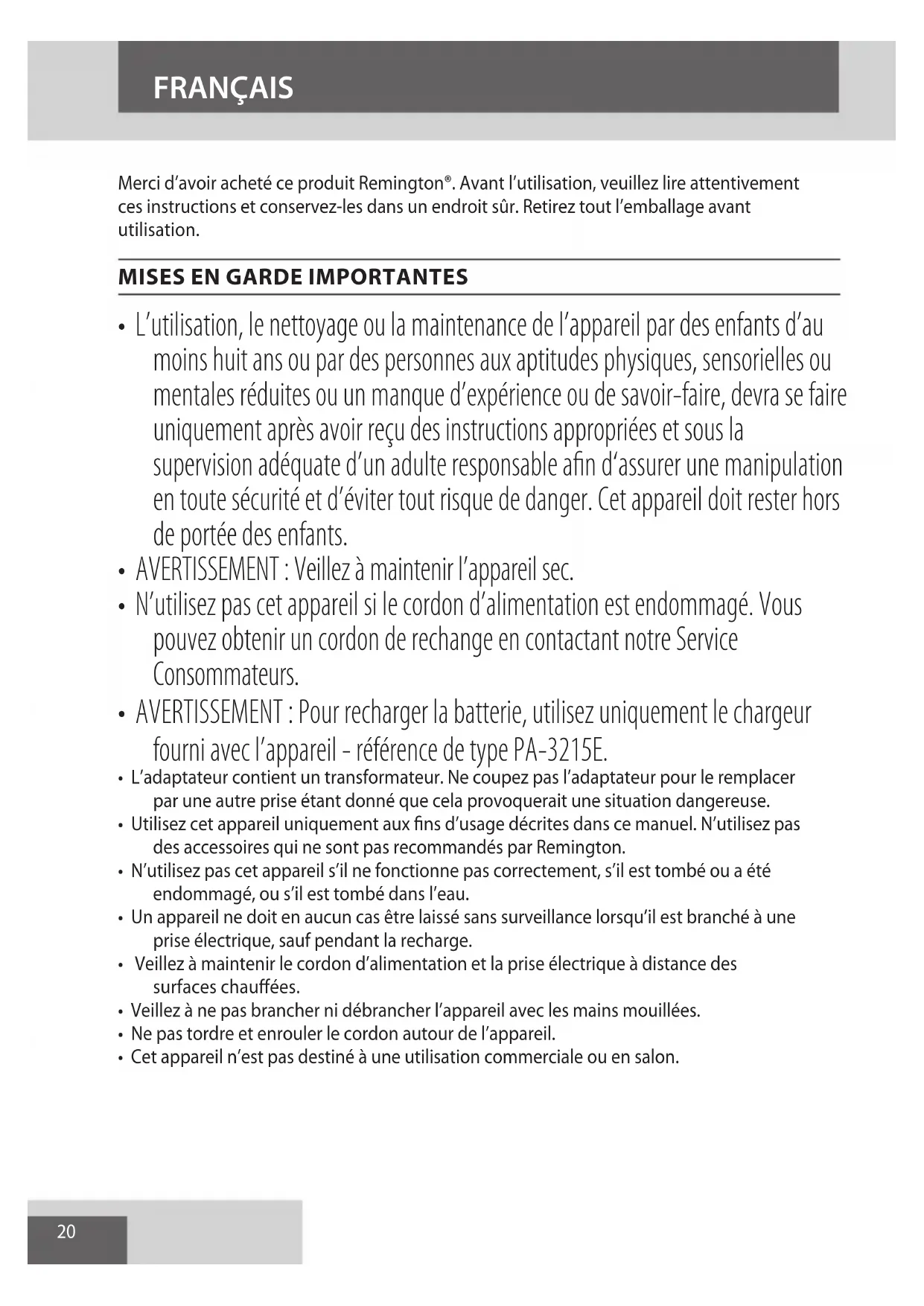 AE20 Merci d’avoir acheté ce produit Remington®. Avant l’utilisation, veuillez lire attentivement ces instructions et conservez-les dans un endroit sûr. Retirez tout l’emballage avant utilisation.