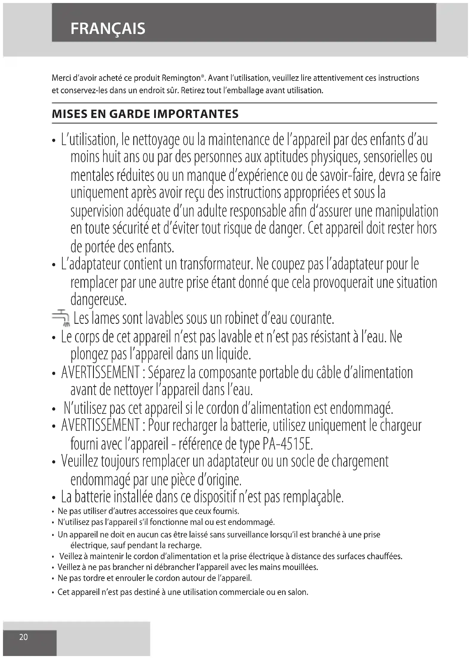 AE20 Merci d’avoir acheté ce produit Remington®. Avant l’utilisation, veuillez lire attentivement ces instructions et conservez-les dans un endroit sûr. Retirez tout l’emballage avant utilisation.