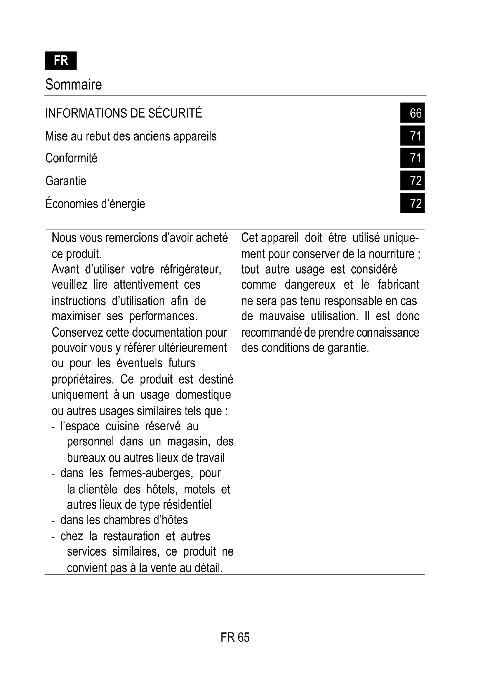 Nous vous remercions d’avoir acheté ce produit. Avant d’utiliser votre réfrigérateur, veuillez lire attentivement ces instructions d’utilisation afin de maximiser ses performances. Conservez cette documentation pour pouvoir vous y référer ultérieurement ou pour les éventuels futurs propriétaires. Ce produit est destiné uniquement à un usage domestique ou autres usages similaires tels que : - l’espace cuisine réservé au personnel dans un magasin, des bureaux ou autres lieux de travail - dans les fermes-auberges, pour la clientèle des hôtels, motels et autres lieux de type résidentiel - dans les chambres d’hôtes - chez la restauration et autres services similaires, ce produit ne convient pas à la vente au détail. Cet appareil doit être utilisé unique- ment pour conserver de la nourriture ; tout autre usage est considéré comme dangereux et le fabricant ne sera pas tenu responsable en cas de mauvaise utilisation. Il est donc recommandé de prendre connaissance des conditions de garantie.FR 66