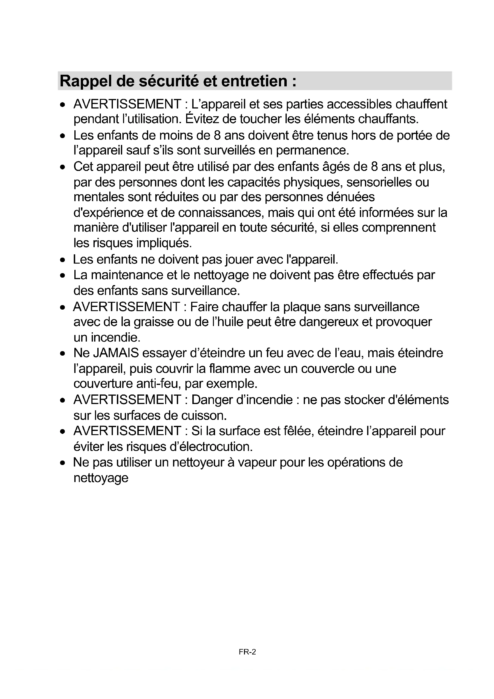 Diese Informationen sind als Teil der Betriebsanleitung des Gerätes zu betrachten. DE-21 KRCDJ642Rappel de sécurité et entretien : x AVERTISSEMENT : L’appareil et ses parties accessibles chauffent pendant l’utilisation. Évitez de toucher les éléments chauffants. x Les enfants de moins de 8 ans doivent être tenus hors de portée de l’appareil sauf s’ils sont surveillés en permanence. x Cet appareil peut être utilisé par des enfants âgés de 8 ans et plus, par des personnes dont les capacités physiques, sensorielles ou mentales sont réduites ou par des personnes dénuées d'expérience et de connaissances, mais qui ont été informées sur la manière d'utiliser l'appareil en toute sécurité, si elles comprennent les risques impliqués. x Les enfants ne doivent pas jouer avec l'appareil. x La maintenance et le nettoyage ne doivent pas être effectués par des enfants sans surveillance. x AVERTISSEMENT : Faire chauffer la plaque sans surveillance avec de la graisse ou de l’huile peut être dangereux et provoquer un incendie. x Ne JAMAIS essayer d’éteindre un feu avec de l’eau, mais éteindre l’appareil, puis couvrir la flamme avec un couvercle ou une couverture anti-feu, par exemple. x AVERTISSEMENT : Danger d’incendie : ne pas stocker d'éléments sur les surfaces de cuisson. x AVERTISSEMENT : Si la surface est fêlée, éteindre l’appareil pour éviter les risques d’électrocution. x Ne pas utiliser un nettoyeur à vapeur pour les opérations de nettoyage