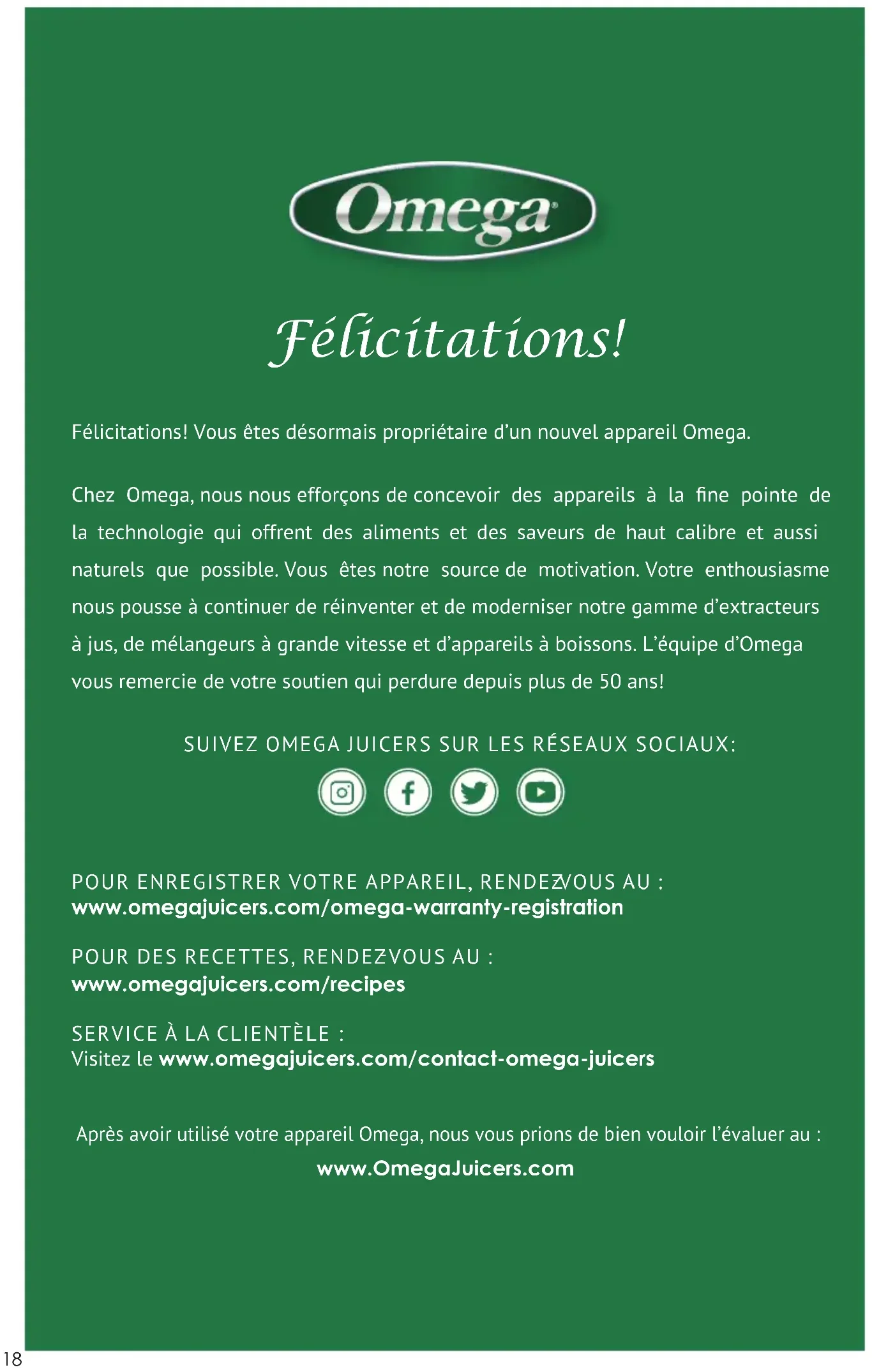 VOUS AU : www.omegajuicers.com/recipes SERVICE À LA CLIENTÈLE: Visitez le www.omegajuicers.com/contact-omega-juicers Après avoir utilisé votre appareil Omega, nous vous prions de bien vouloir l’évaluer au : www.OmegaJuicers.com SUIVEZ OMEGA JUICERS SUR LES RÉSEAUX SOCIAUX:19