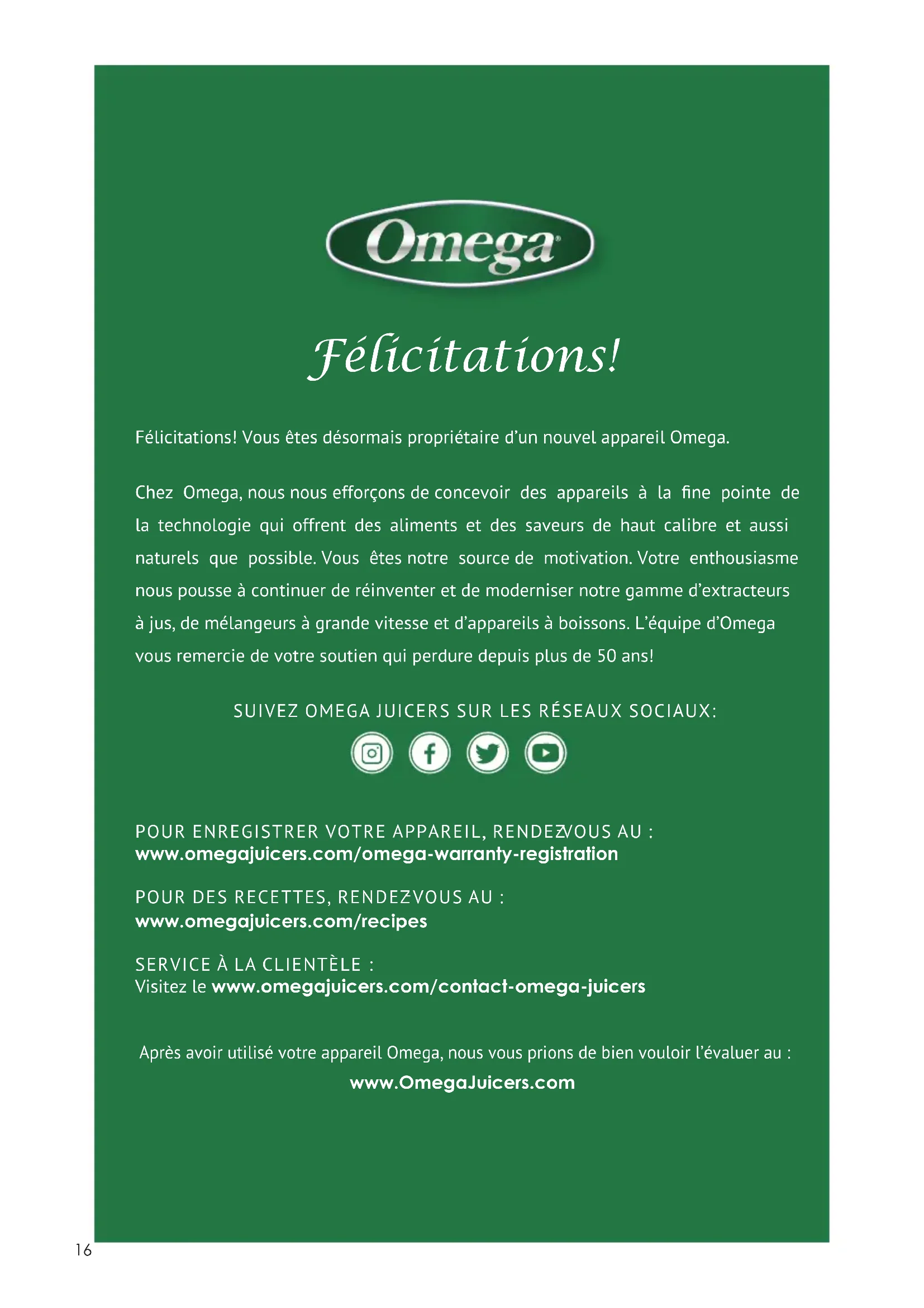 VOUS AU : www.omegajuicers.com/recipes SERVICE À LA CLIENTÈLE: Visitez le www.omegajuicers.com/contact-omega-juicers Après avoir utilisé votre appareil Omega, nous vous prions de bien vouloir l’évaluer au : www.OmegaJuicers.com SUIVEZ OMEGA JUICERS SUR LES RÉSEAUX SOCIAUX:17