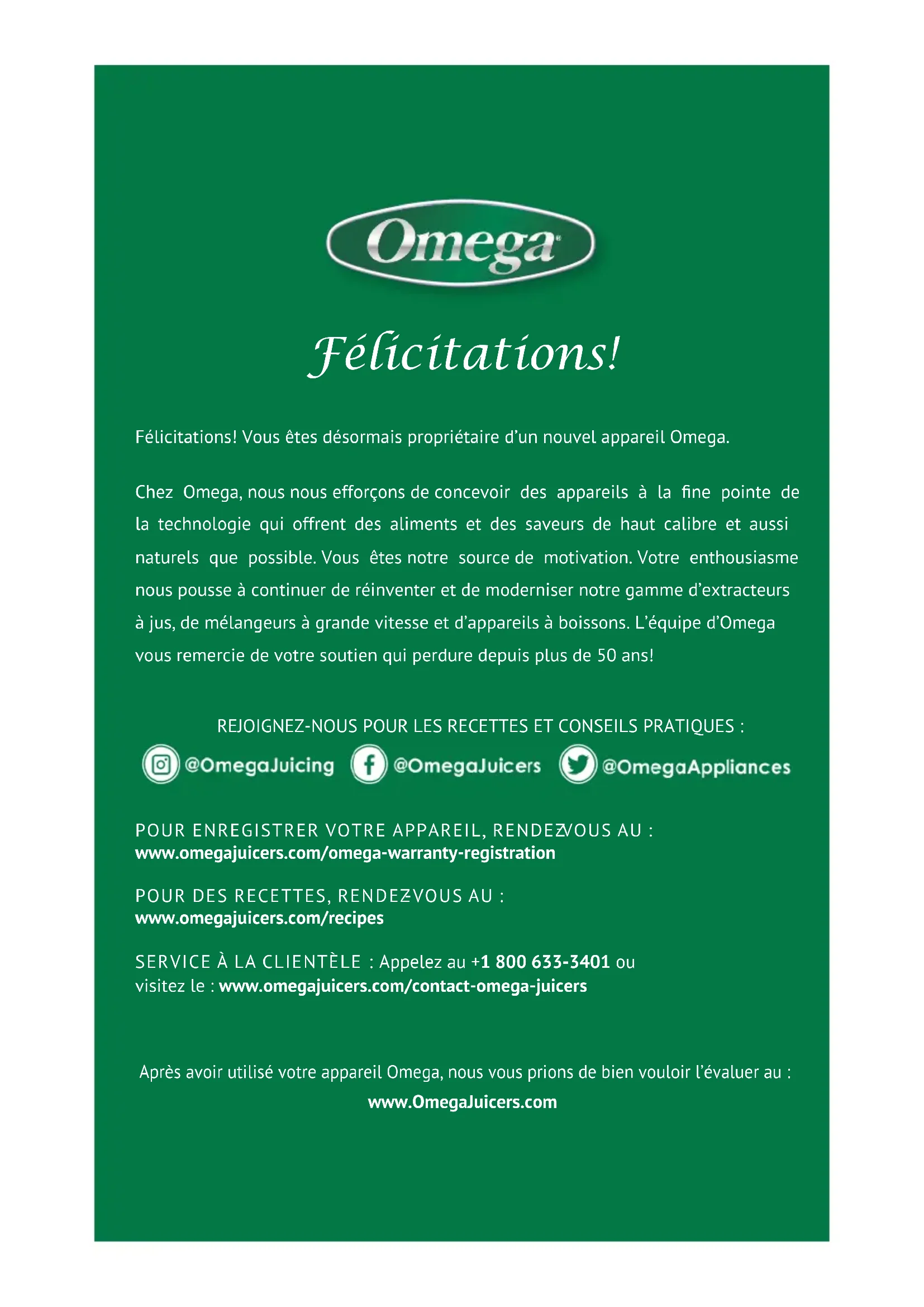 RECIPESFélicitations! Félicitations! Vous êtes désormais propriétaire d’un nouvel appareil Omega. Chez Omega, nous nous efforçons de concevoir des appareils à la ne pointe de la technologie qui offrent des aliments et des saveurs de haut calibre et aussi naturels que possible. Vous êtes notre source de motivation. Votre enthousiasme nous pousse à continuer de réinventer et de moderniser notre gamme d’extracteurs à jus, de mélangeurs à grande vitesse et d’appareils à boissons. L’équipe d’Omega vous remercie de votre soutien qui perdure depuis plus de 50 ans!